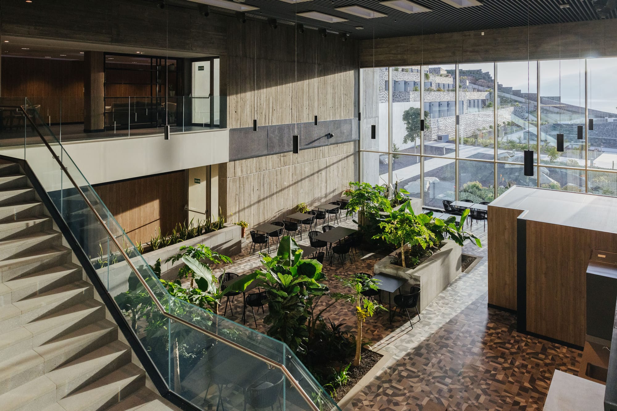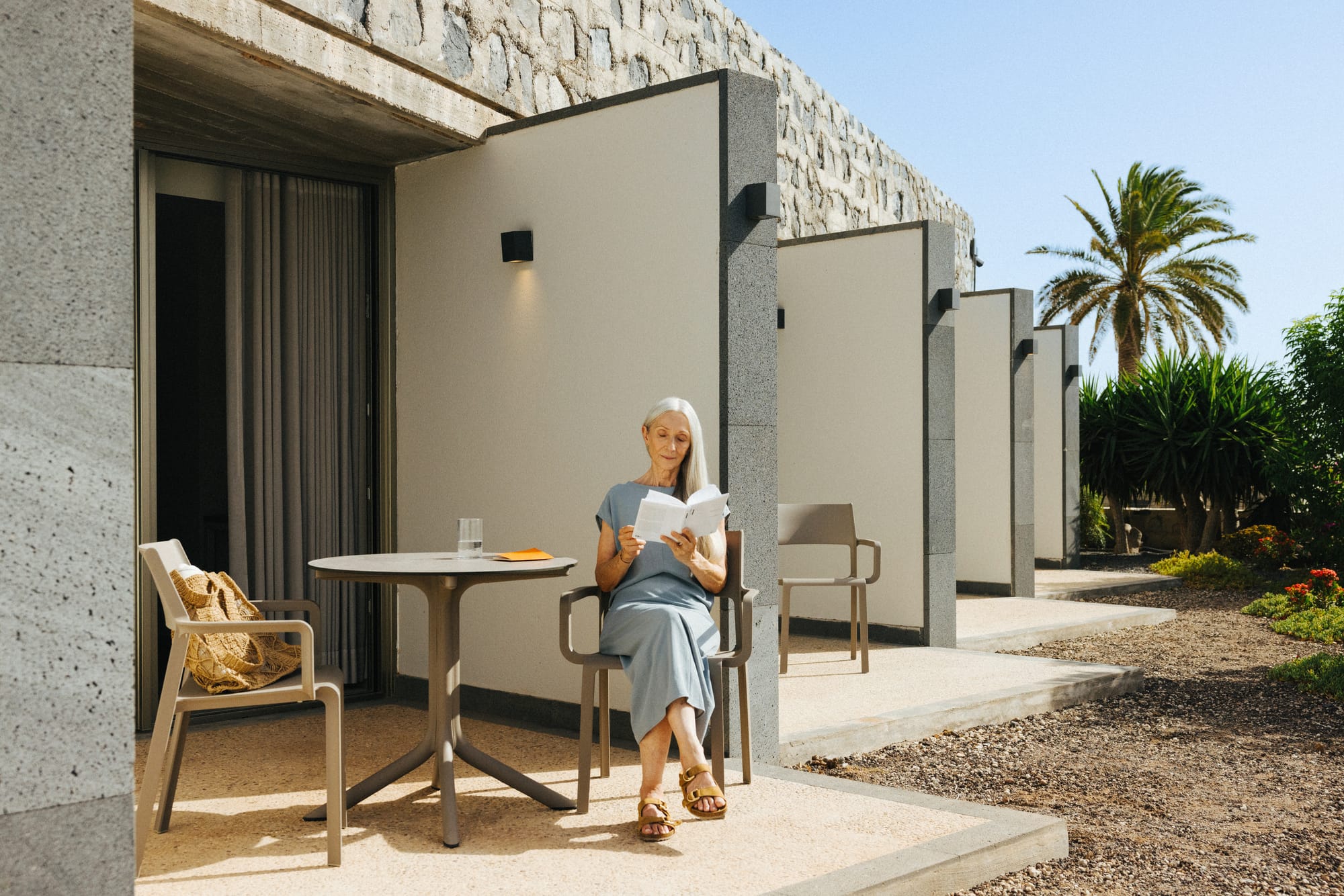 Este proyecto es una escultura arquitectónica en lo alto de un acantilado que guarece al visitante del viento. En ella reinan las geometrías fragmentadas y los espacios diáfanos, labrados a mano por maestros canteros venidos de distintas zonas de la provincia. El hotel cuenta con sus propios espacios ambientales, compuestos por especies botánicas autóctonas y endémicas del ecosistema canario, así como huertos ecológicos y jardines comestibles que requieren muy poca agua, reforzando su compromiso con el entorno.