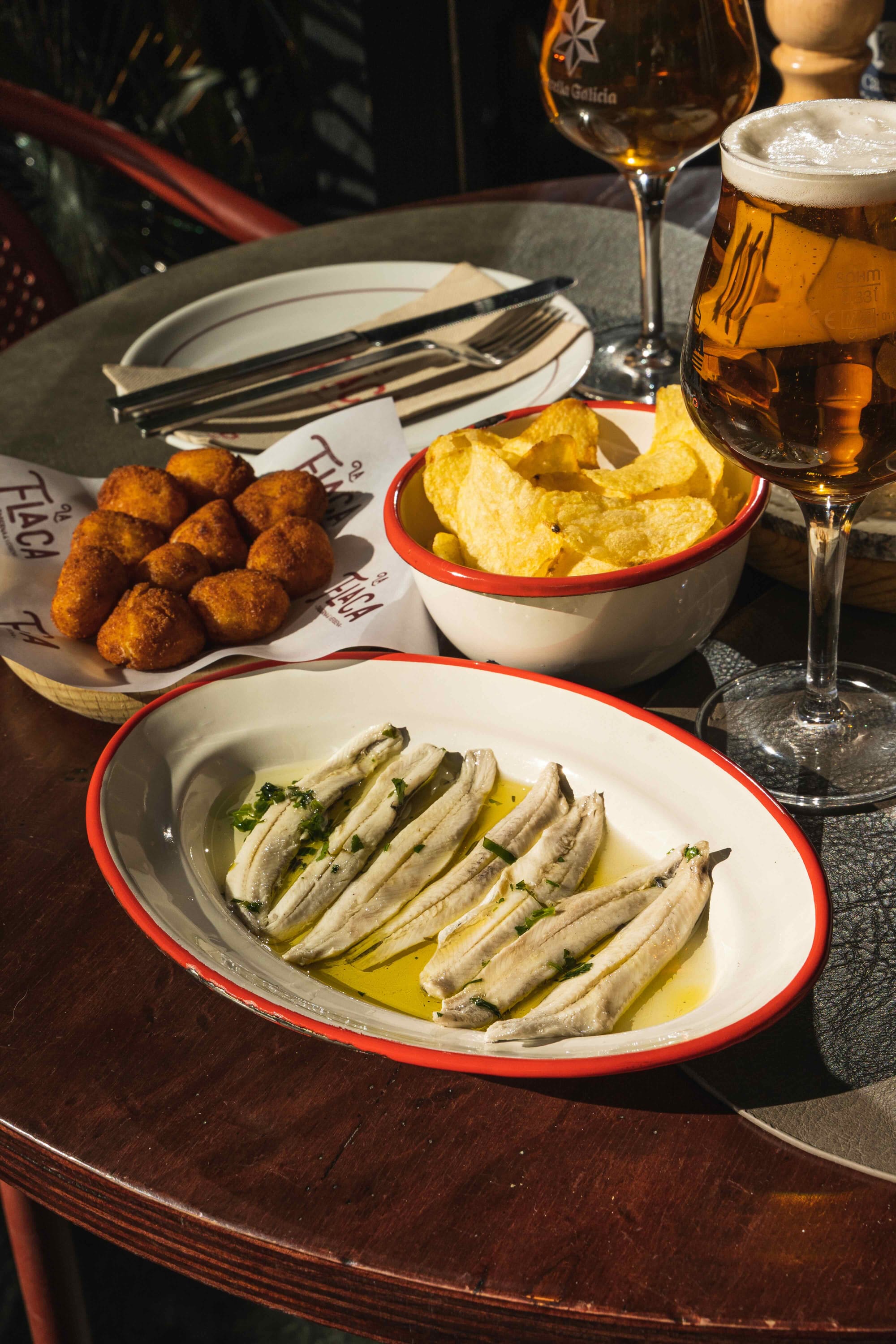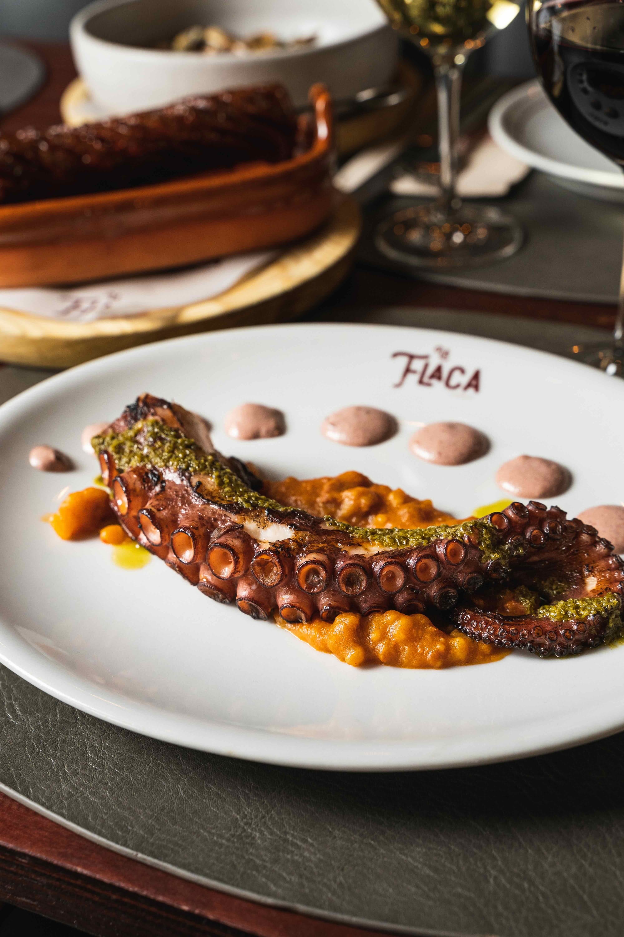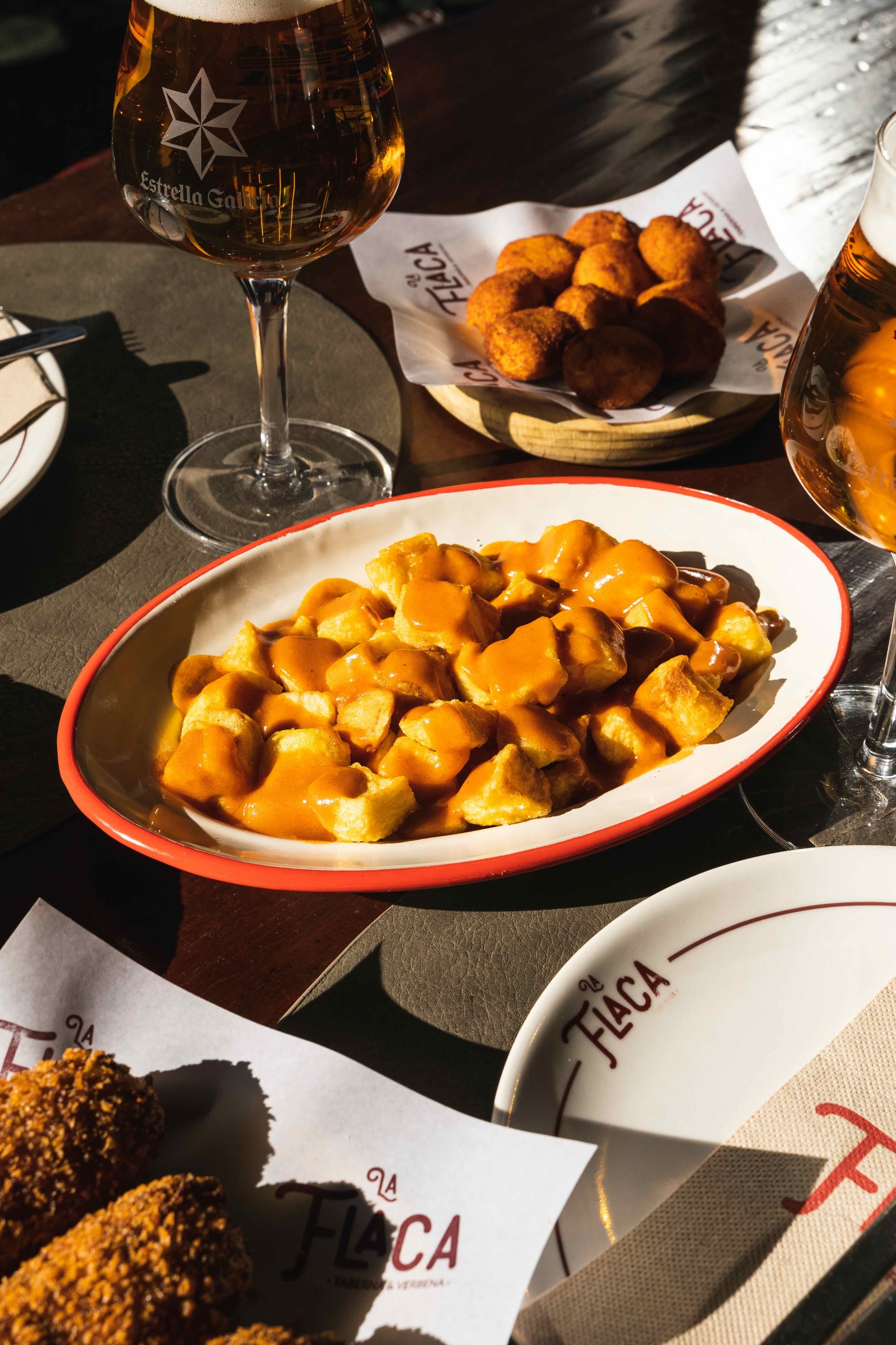 La Flaca es una de esas tabernas (o bares castizos) donde esta sana costumbre social se prolonga durante horas y horas, mientras desfilan por barra y mesas los más suculentos y madrileñísimos manjares: las bravas de Mila, las gildas y boquerones en vinagre, el pincho de tortilla, los mejillones en escabeche, el “medio pollo de mi suegra”, los calamares fritos, el pepito de ternera, el pulpo a la brasa…