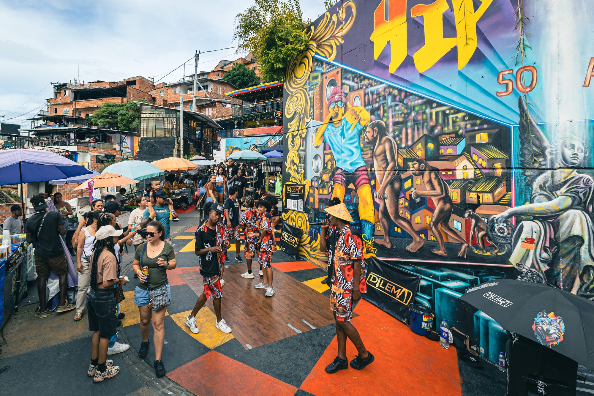 Alrededor de las escaleras eléctricas y en pequeñas plazoletas, es habitual encontrarse con actuaciones callejeras de hip hop, desde freestyle y rap en vivo hasta exhibiciones de breakdance y baile urbano que se montan en escenarios fijos o improvisados: una esquina con buen espacio, un descansillo, una cancha o un mirador donde se forma un semicírculo de público. Parte de esa energía viene de la propia escena cultural del barrio y de colectivos como Casa Kolacho, un referente comunitario ligado a la cultura hip hop en la comuna, que ha trabajado durante años en formación y actividades culturales.