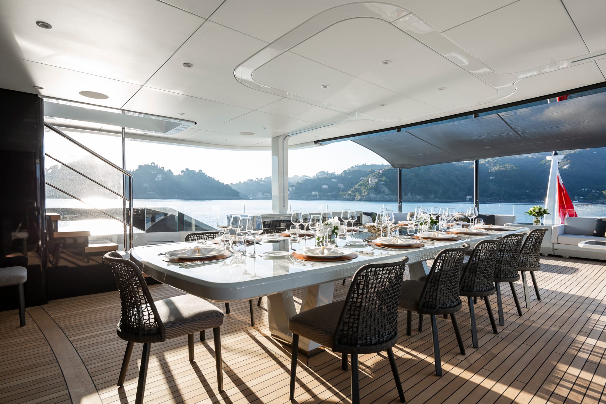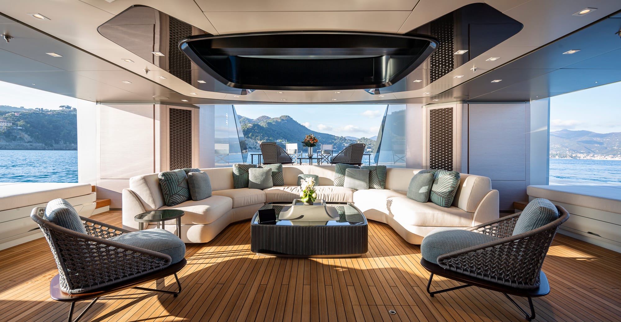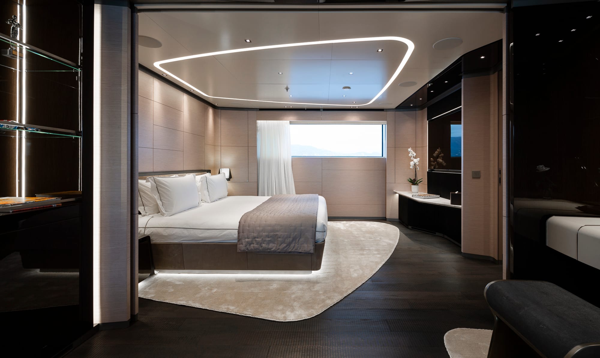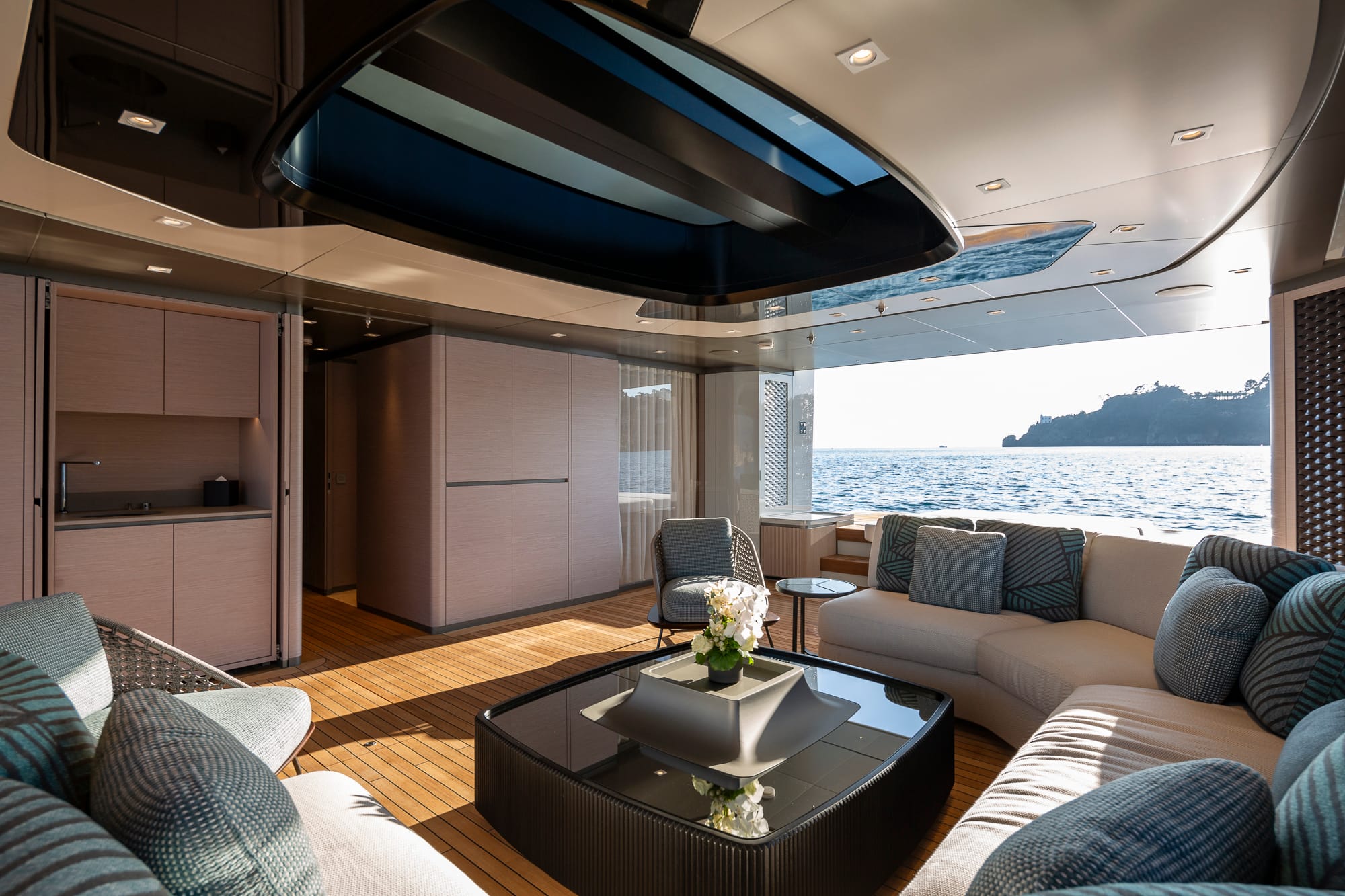 En la cubierta principal se sitúa la suite del propietario, de manga completa, con salón privado, estudio y terraza desplegable. Los cinco camarotes de invitados —dos de ellos con literas Pullman— permiten alojar hasta 12 pasajeros con total confort.