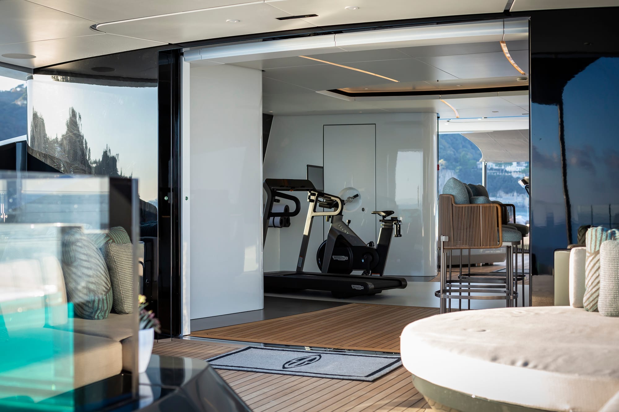 El gimnasio del fly deck, cerrado por cristaleras, ofrece vistas de 360° y puede transformarse en espacio abierto al aire libre. Junto a él, una piscina con jets integrados y una zona de bar completan la experiencia de bienestar.