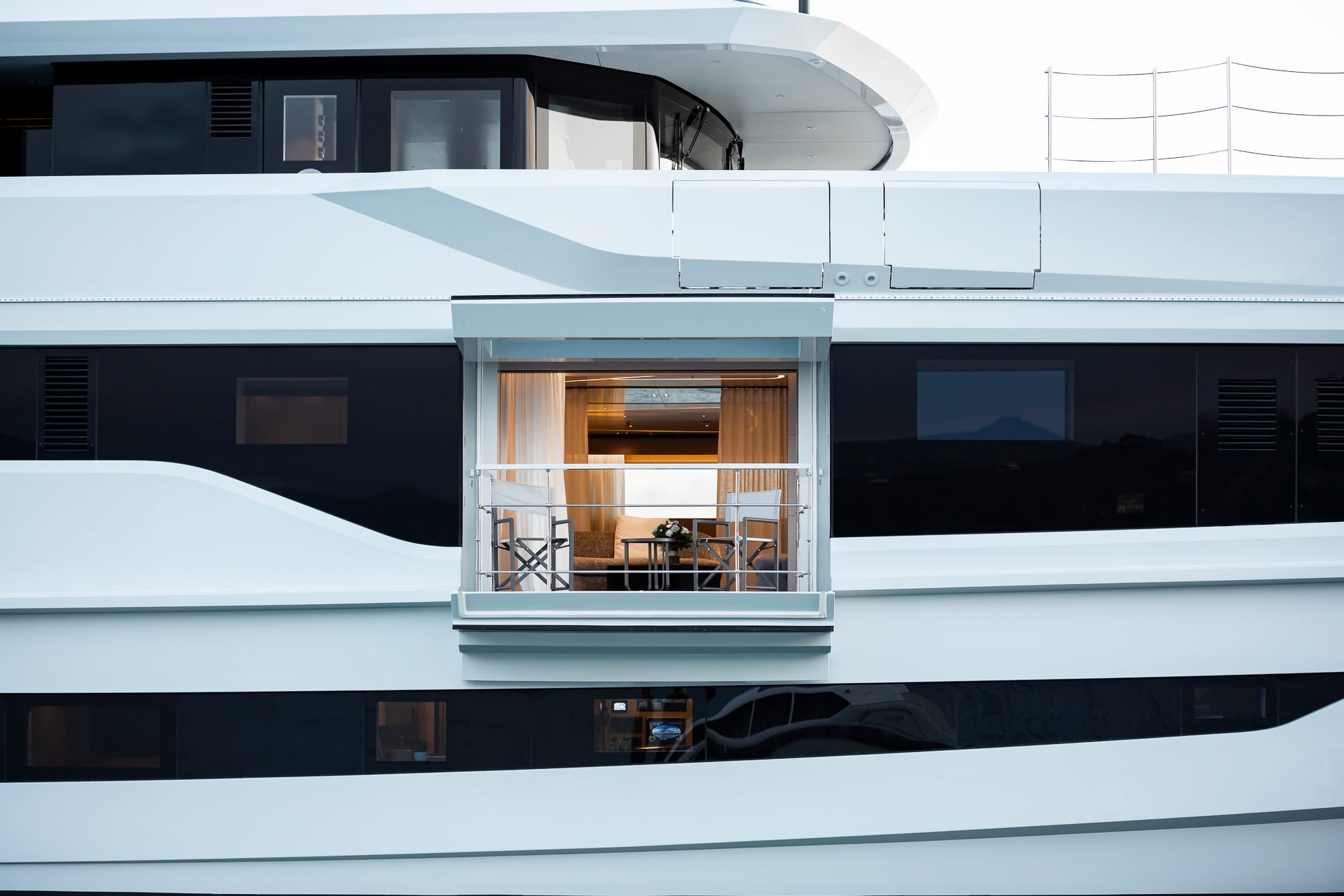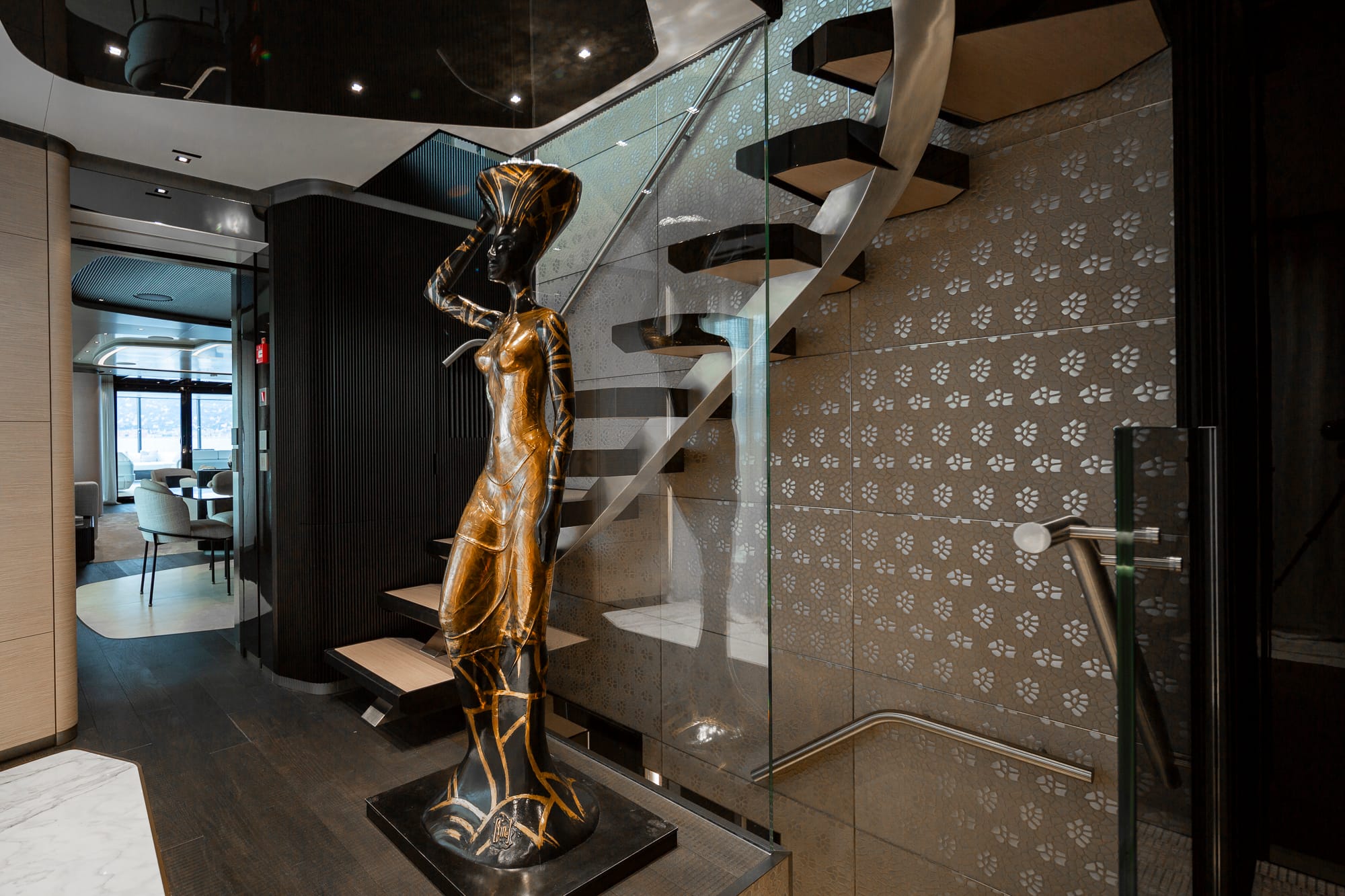 Uno de los rasgos más fascinantes del proyecto es el pasillo panorámico en la cubierta inferior, que permite observar la sala de máquinas a través de amplias ventanas, rindiendo homenaje a la pasión del propietario por la ingeniería. El equilibrio entre lo técnico y lo estético se mantiene en toda la embarcación, donde cada elemento funcional ha sido elevado a categoría de diseño.