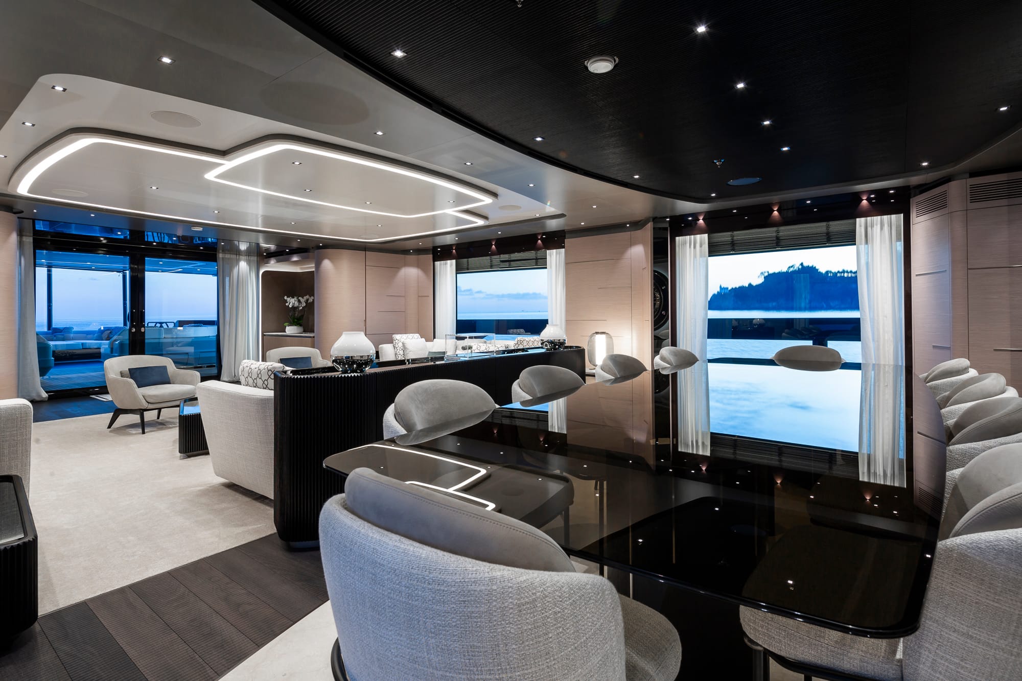 A diferencia de los interiores náuticos tradicionales, el Diamond Binta renuncia a las líneas rectas y opta por formas suaves y envolventes. Los sofás circulares y las mesas escultóricas de tres piezas evocan un sentido de fluidez, mientras que los techos, en tonos gris perla y marrón humo, integran tiras LED curvas que subrayan las zonas de convivencia y crean una iluminación atmosférica, casi teatral.