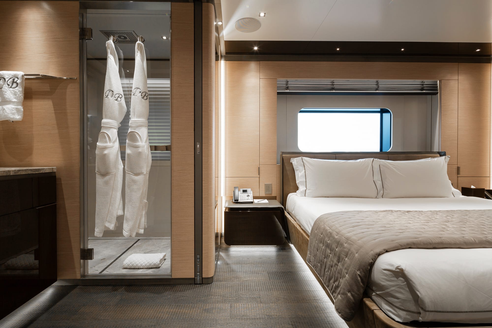 El interior despliega una combinación exquisita de roble en distintos acabados (cepillado, satinado y oscuro con textura “tatami”), mármoles naturales —como Cappuccino, Calacatta, Botticino y Fior di Bosco— y metales satinados que aportan profundidad visual. Los tonos van del gris paloma al arena húmeda, generando una atmósfera tranquila y envolvente. Las paredes del vestíbulo están revestidas en cuero decorado, mientras que las camas y cabeceros presentan paneles de cuero duro a medida.