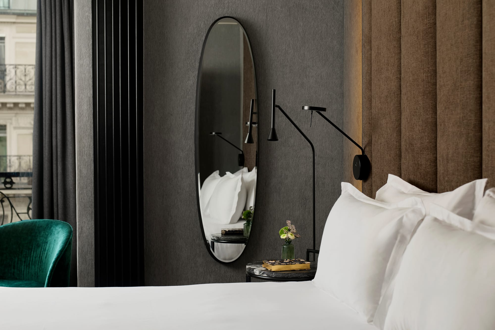 El hotel cuenta con 101 habitaciones y suites, algunas de ellas con balcón con vistas a la rue La Fayette y, en los pisos superiores, a la Torre Eiffel. Los interiores combinan tonos cálidos con detalles que evocan el París más artístico: tejidos, grafismos y referencias visuales que traen a la memoria las décadas en que la ciudad era el epicentro mundial de la moda y las artes escénicas. El resultado es un ambiente que mezcla elegancia atemporal con confort moderno.
