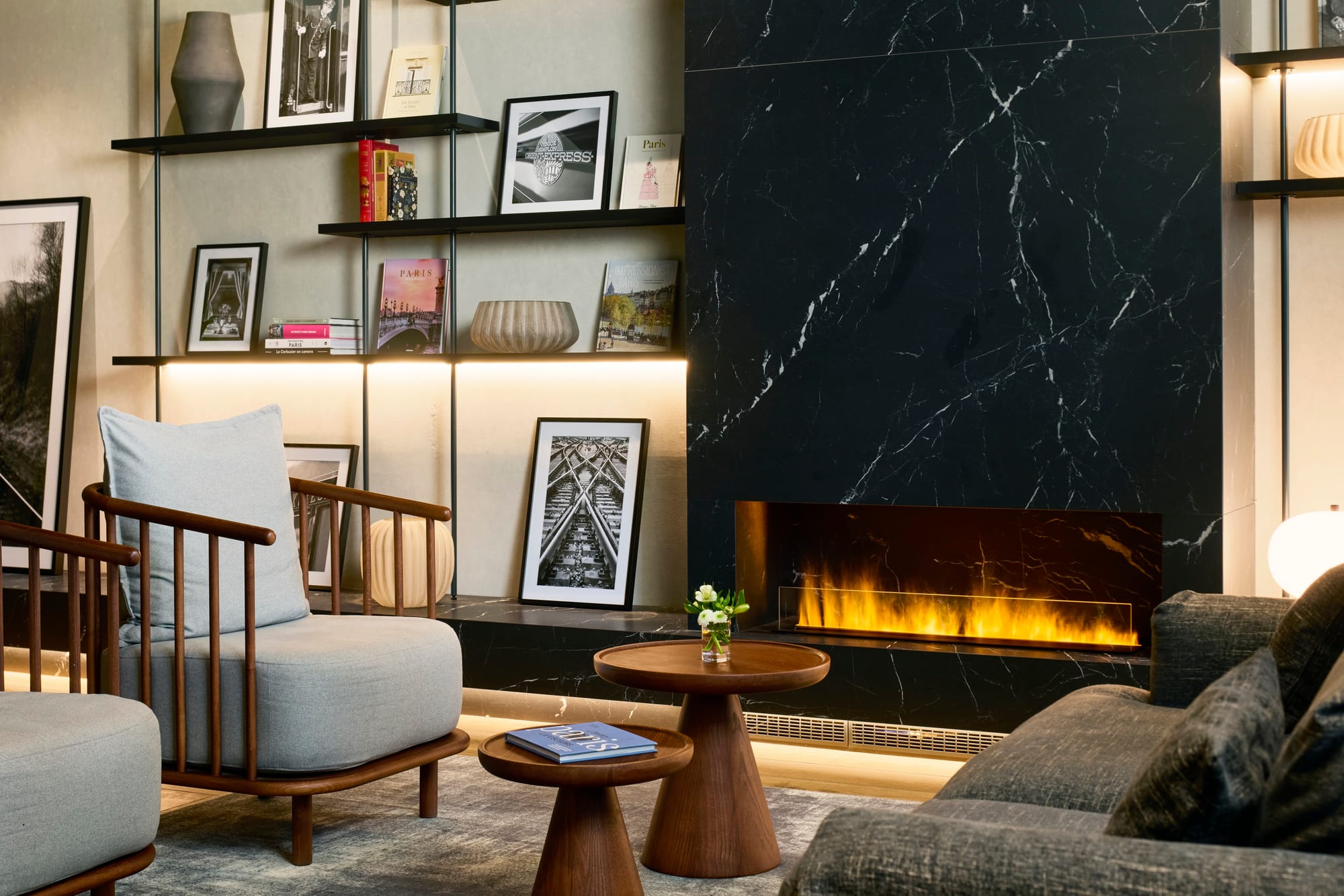 Los espacios comunes refuerzan esa atmósfera. El lobby cuenta con chimenea y zonas lounge pensadas para crear un ambiente íntimo, alejado de la impersonalidad de los grandes hoteles de cadena. El bar del hotel completa la propuesta con un espacio tranquilo donde descansar después de una jornada en la ciudad, ya sea de turismo cultural, compras en los Grands Boulevards o reuniones de trabajo.