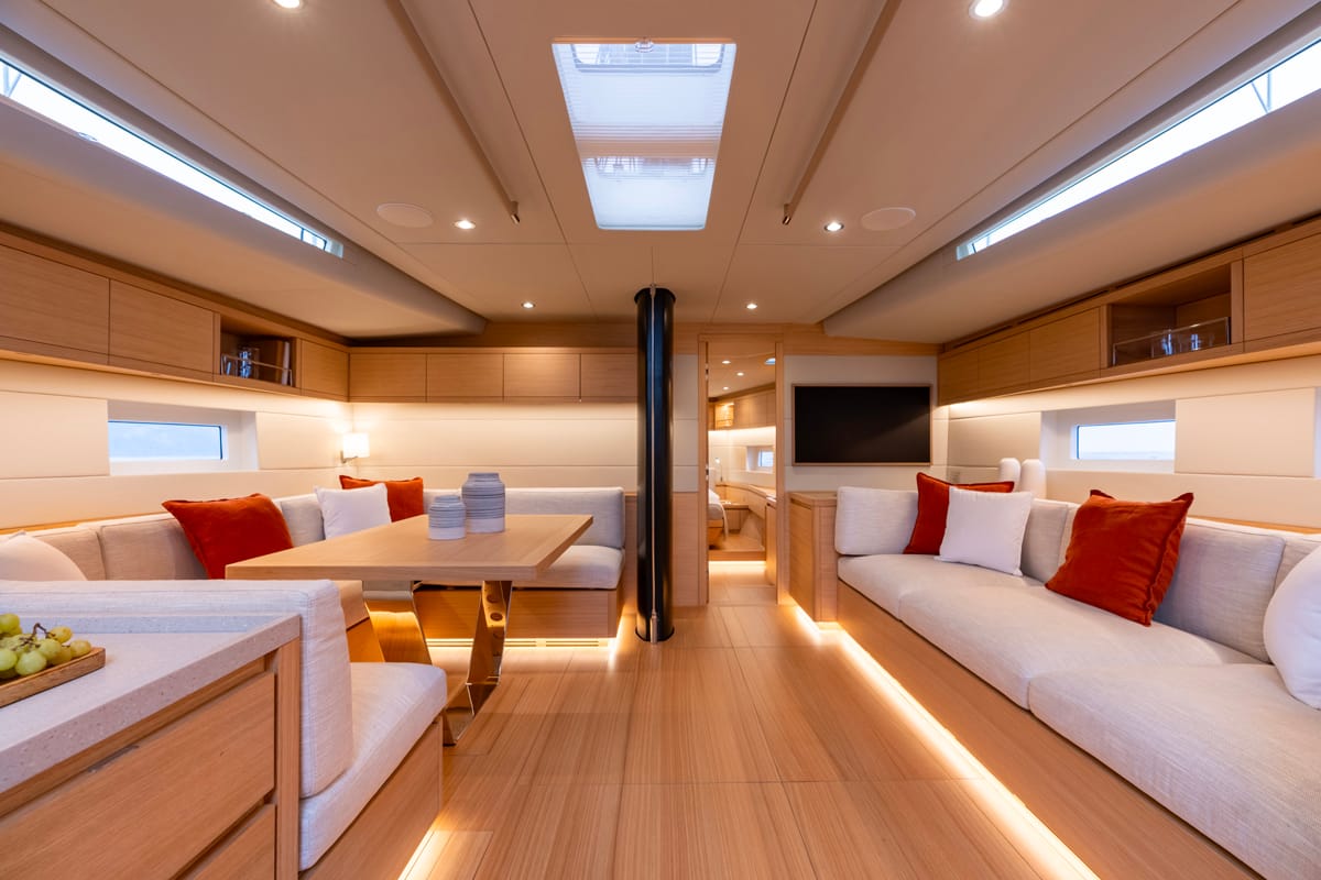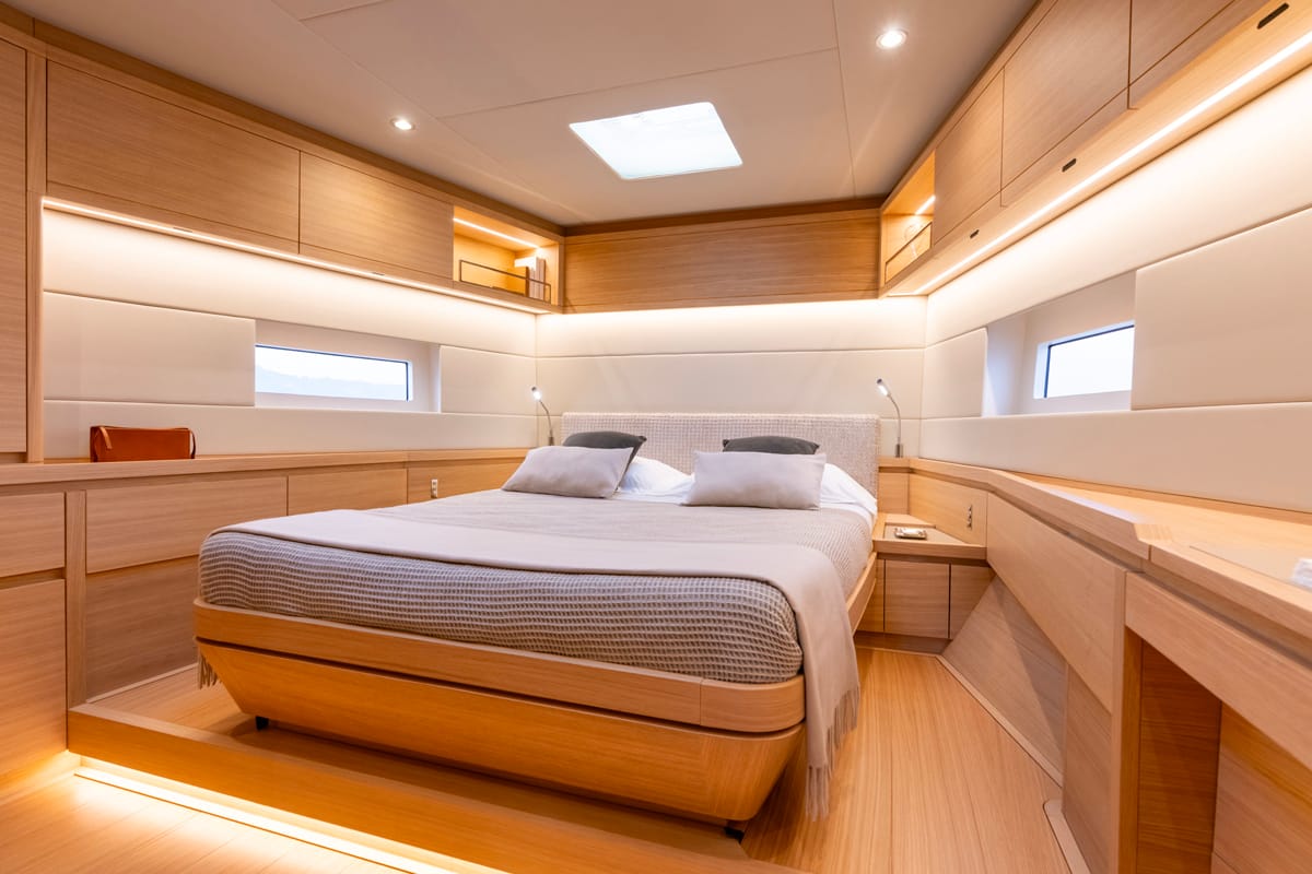Nauta Design ha desarrollado el interior con un principio claro: maximizar el espacio y la ergonomía. El salón central, ahora más bajo y conectado con las cabinas de proa y popa, mejora la circulación y genera una sensación de continuidad. La paleta de materiales —elegida junto al armador— combina maderas nobles y tejidos naturales en tonos neutros que aportan serenidad y elegancia.