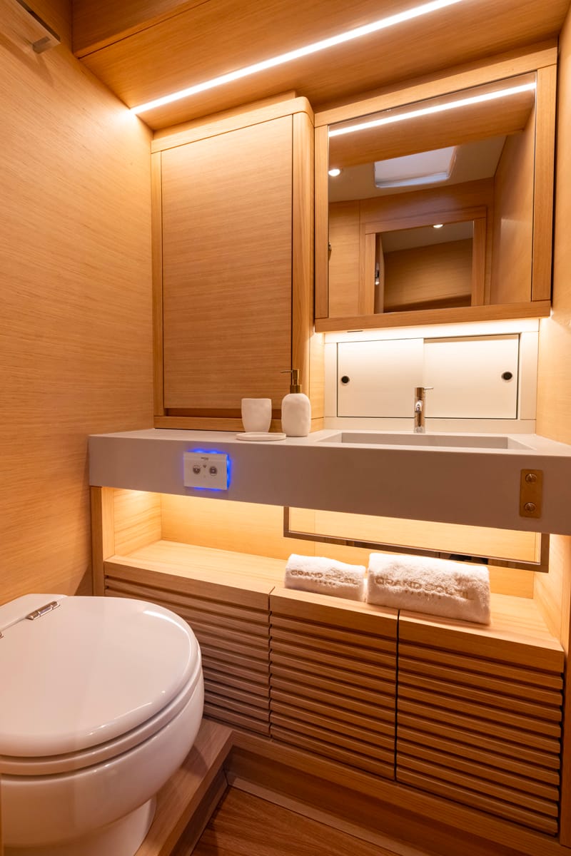 Como todos los modelos del astillero, el Grand Soleil 65 Performance nace con un compromiso claro hacia el medio marino. Los materiales sostenibles y procesos ecológicos forman parte esencial del proyecto: el teca procede de fuentes controladas, las resinas son de base biológica, las pinturas son al agua y los paneles solares integrados alimentan los sistemas de a bordo. Incluso el vidrio laminado mejora el aislamiento térmico y acústico, reduciendo el consumo energético.