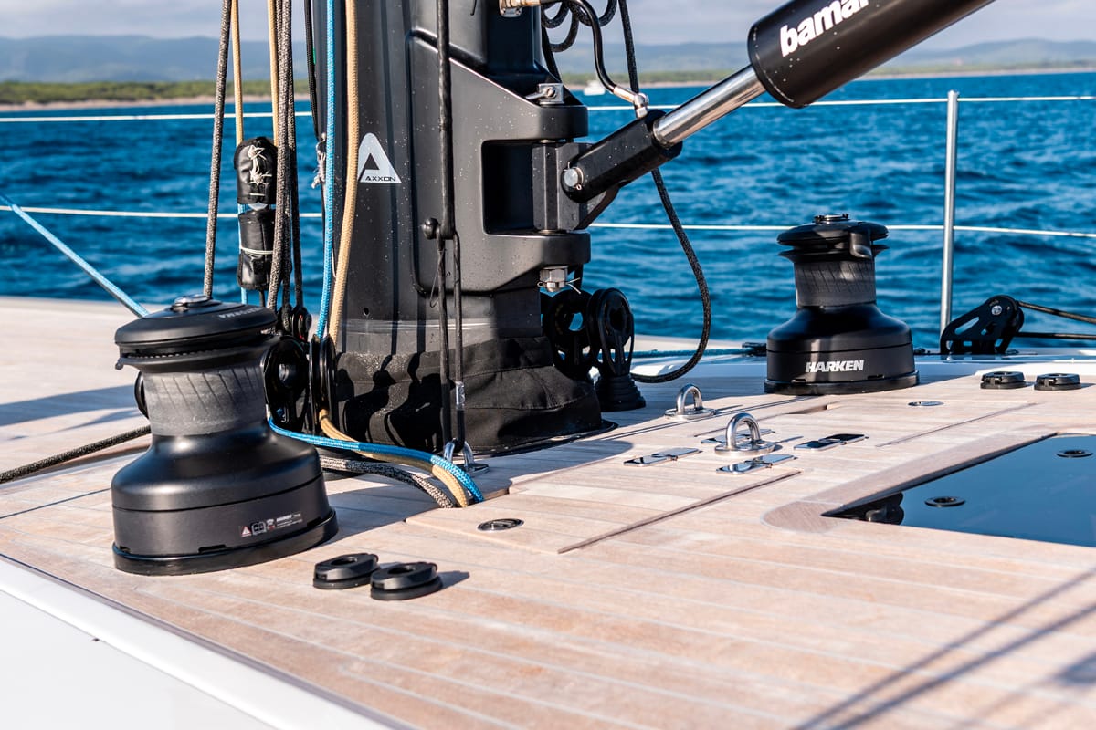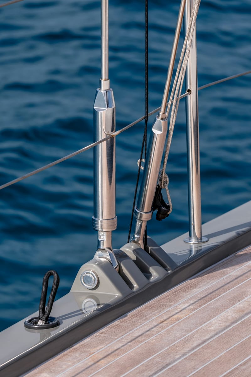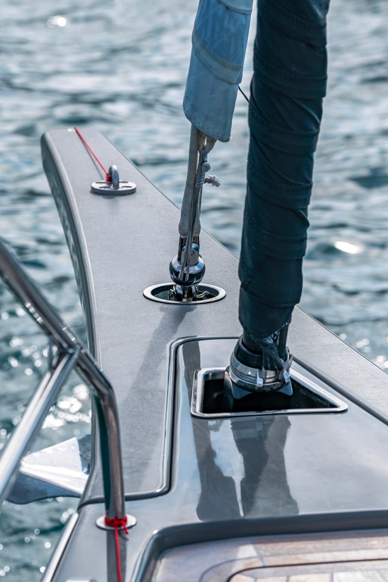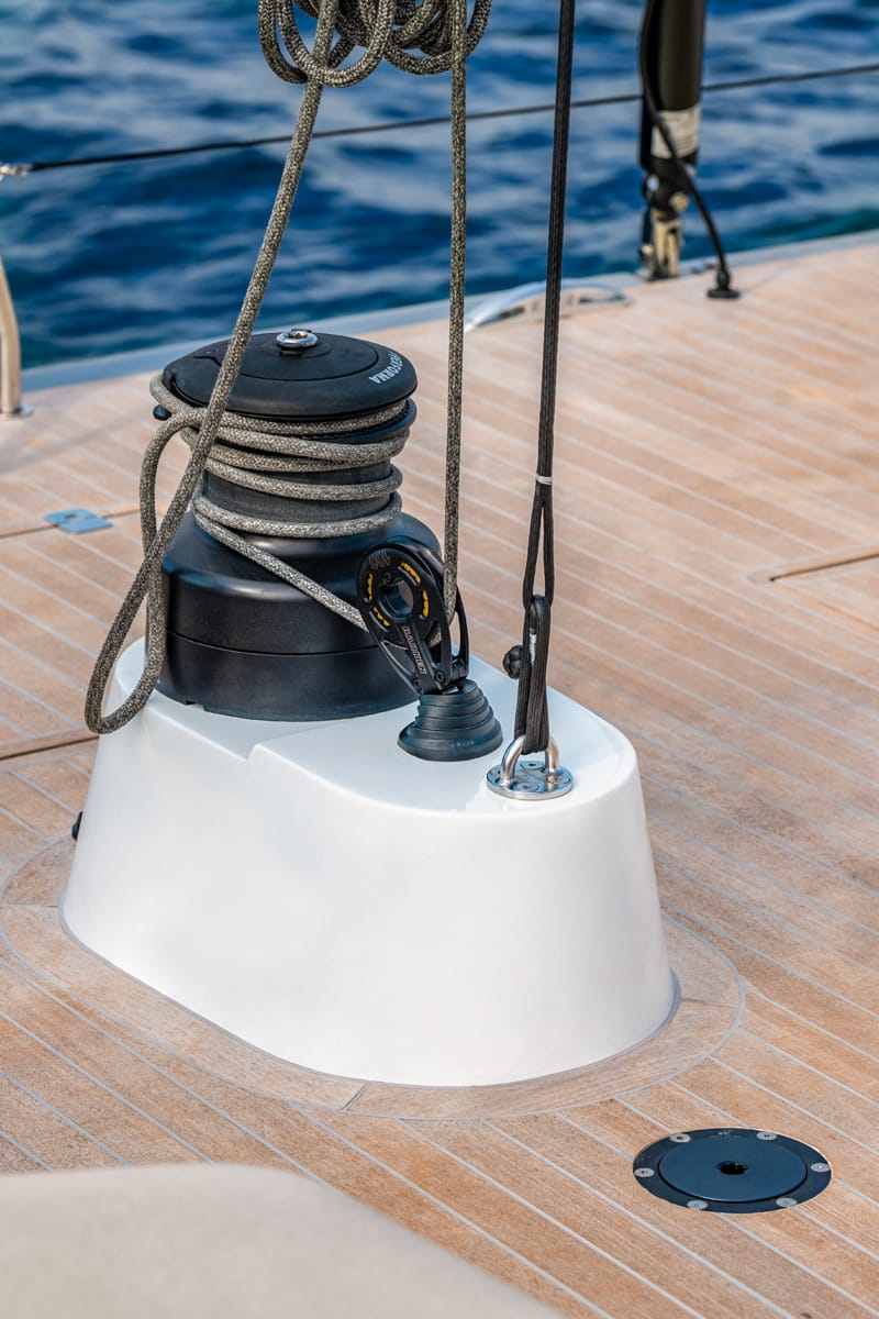 El mástil, ligeramente retrasado, maximiza el triángulo de proa, permitiendo un velamen equilibrado y eficiente. El fiocco autovirante de serie facilita las maniobras incluso con tripulación reducida, y el aparejo puede terzarolarse manteniendo la estabilidad del conjunto. Gracias a su ergonomía y sistemas optimizados, el 65 Performance puede ser navegado por una pareja sin necesidad de tripulación adicional.