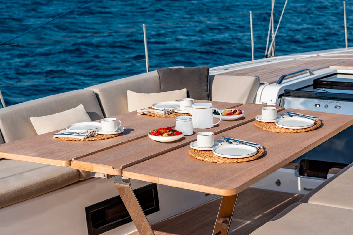 En cubierta, el diseño favorece la navegación activa: todas las maniobras están pensadas para un control inmediato, con ergonomía y funcionalidad al nivel de los superyates. La tuga más baja y las superficies limpias realzan el perfil aerodinámico, mientras los detalles en acero y madera recuerdan la tradición del astillero.