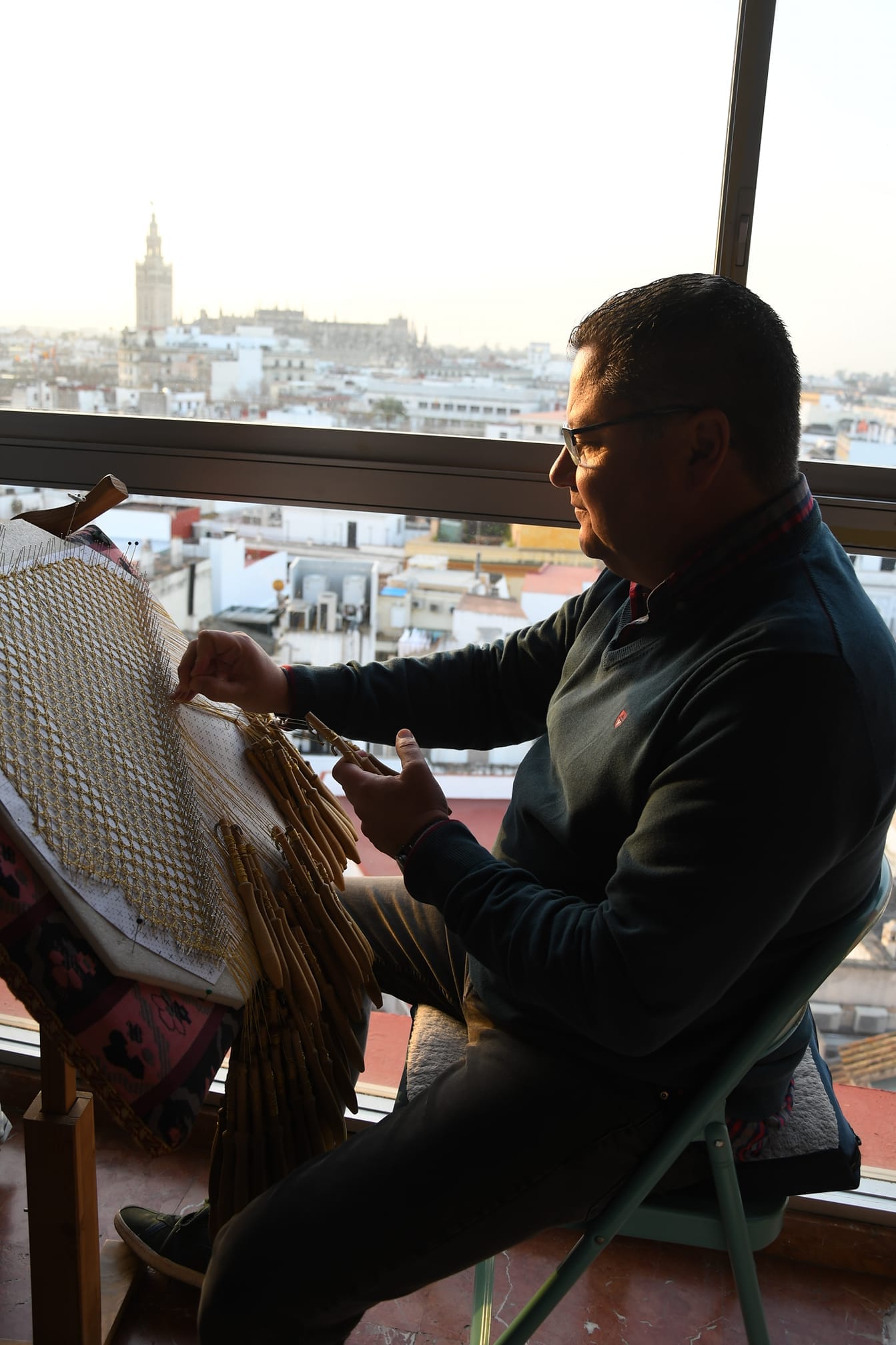 Gran parte del encaje sublime que rodea los mantos de la virgen lo tejen con bolillos en la llamada Corrala de Goles de Sevilla, donde aún se agrupan los oficios artesanales. Alfonso Aguilar Martín regenta Encajes de Sevilla y lo hace a costa de voluntad, pasión y trabajo.