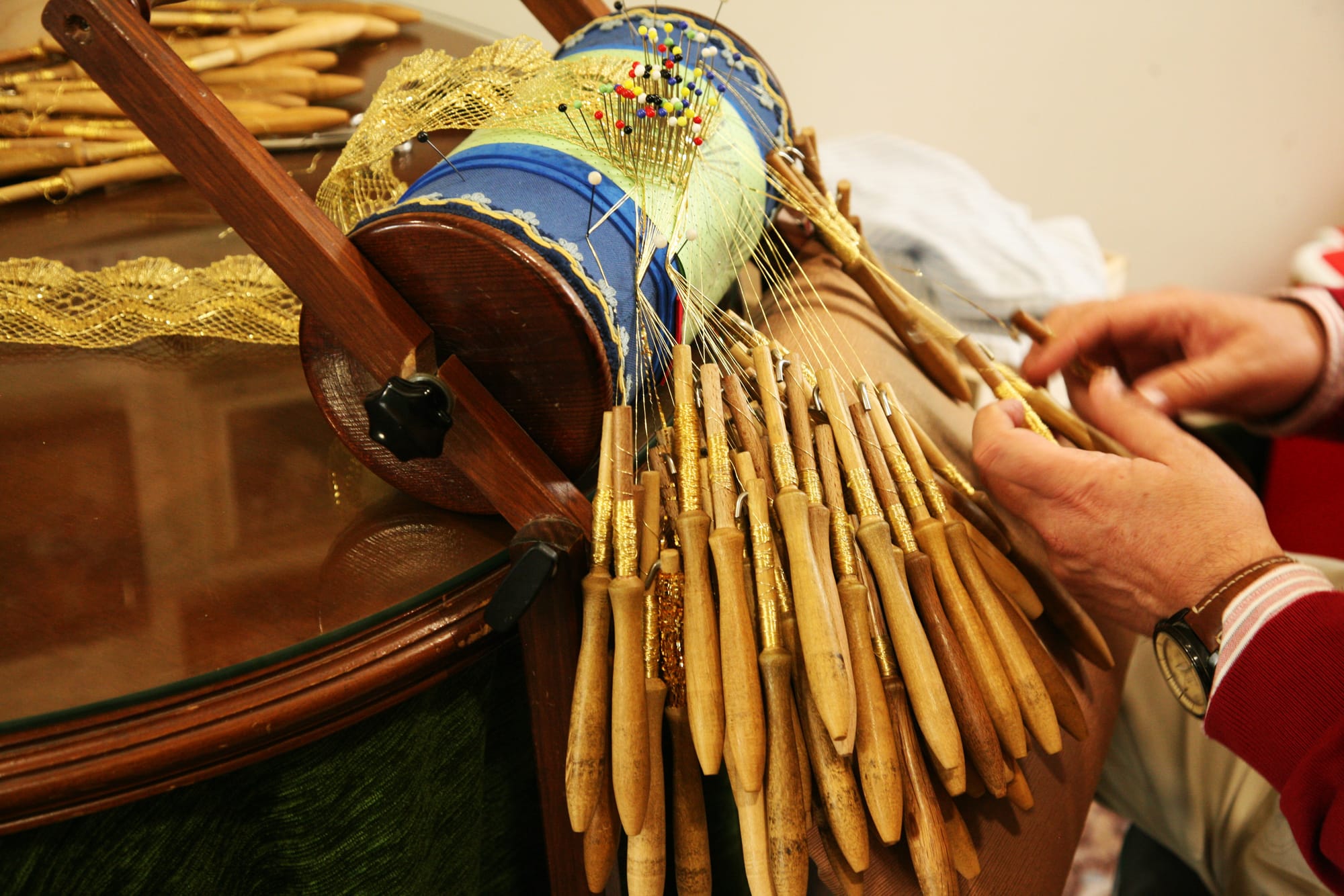 La técnica del encaje de bolillos llegó de los Países Bajos, donde tejían con hilo de algodón el ajuar femenino. Sin embargo, fueron los hilanderos españoles quienes comenzaron a entretejer con hilos metálicos, marca que derivó en el nombre de Punto España.