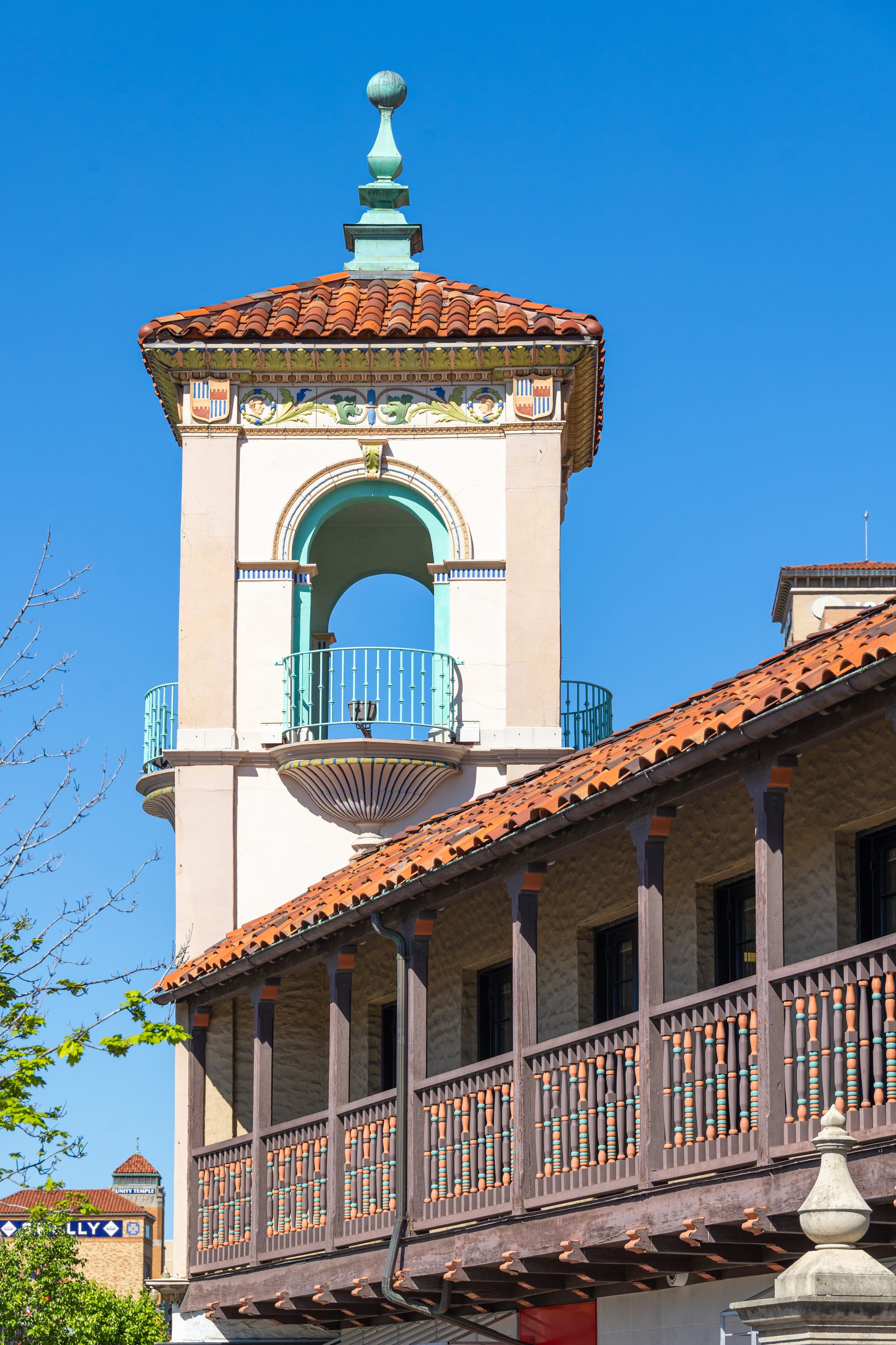 Torres que recuerdan a la Giralda, patios con fuentes de azulejos, balcones de hierro forjado y fachadas de estuco de colores cálidos crean una atmósfera sorprendentemente española. Nichols viajó a Sevilla y quedó prendado de su belleza y su planificación urbana, decidiendo replicar ese encanto en su proyecto.