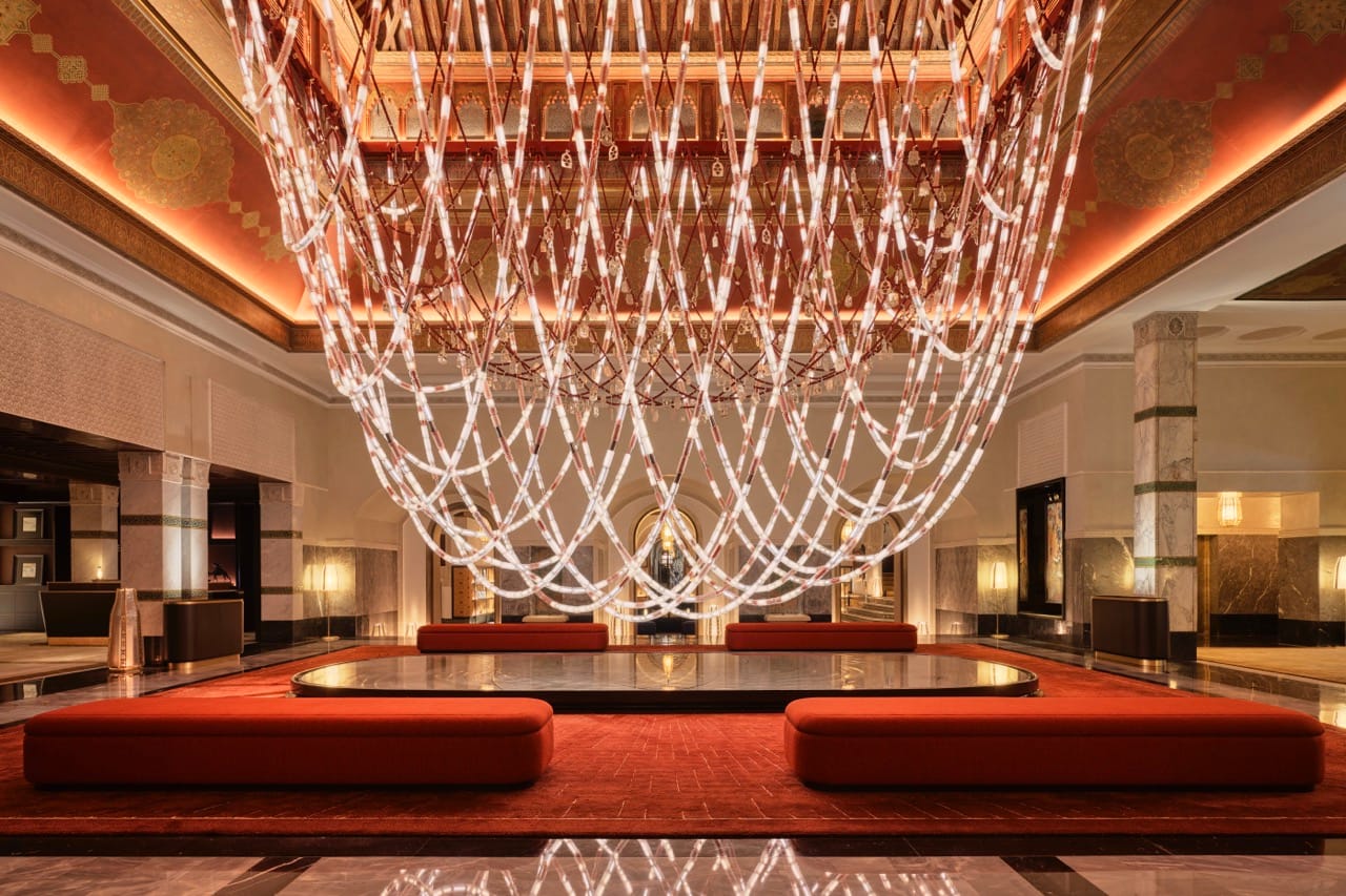 Al entrar es imposible no ver la Lámpara del Centenario. Esta obra maestra, rebautizada ya como la Joya de La Grande Dame, impone su presencia en pleno corazón del hotel. En un homenaje desenfadado a las tamazight, joyas tradicionales bereberes, esta extraordinaria escultura luminosa evoca dos collares suspendidos en el aire. A ambos lados del pasillo que conduce a Le Salon de Thé par Pierre Hermé y al Spa, seis alcobas transportan al visitante a un mundo cargado de misterio y exotismo a través de un viaje por la historia de Marruecos.