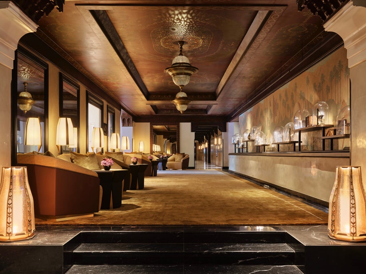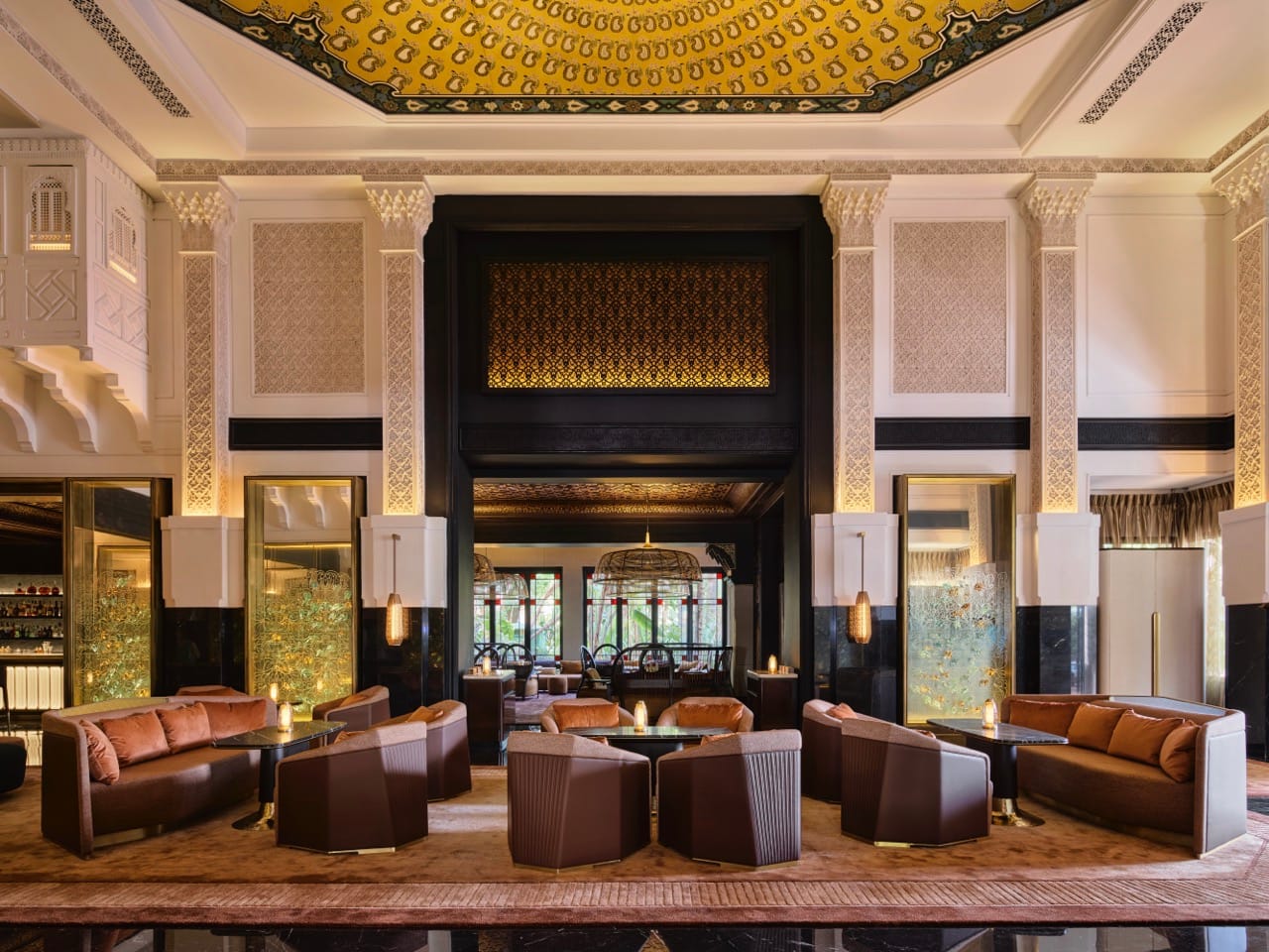 Hablando de la recepción. Tras la renovación, dos salones de inspiración morisca y con un toque Art Déco invitan a los recién llegados a sumergirse en la cultura local, creando una transición fluida entre el exterior y el interior. La inclusión de lámparas de techo y faroles resalta los frescos y mosaicos. Aquí hay que mencionar a Bawab, la icónica figura del centenario.