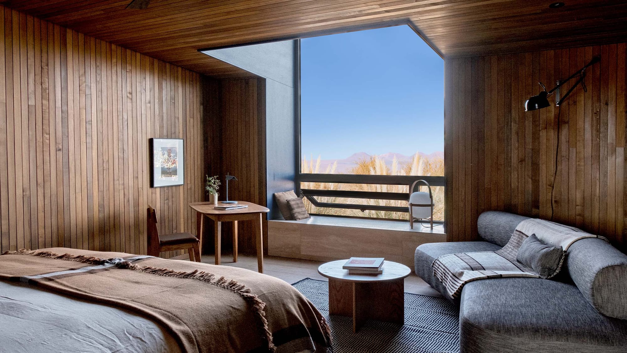 El hotel fue concebido por el estudio chileno AATA Arquitectos y destaca por su integración con el paisaje. Los muros de adobe y piedra volcánica evocan la tradición constructiva atacameña, mientras que los ventanales panorámicos inundan los espacios de luz natural y enmarcan el desierto como parte del interior. La decoración combina textiles andinos, maderas nativas y piezas de artesanía local.