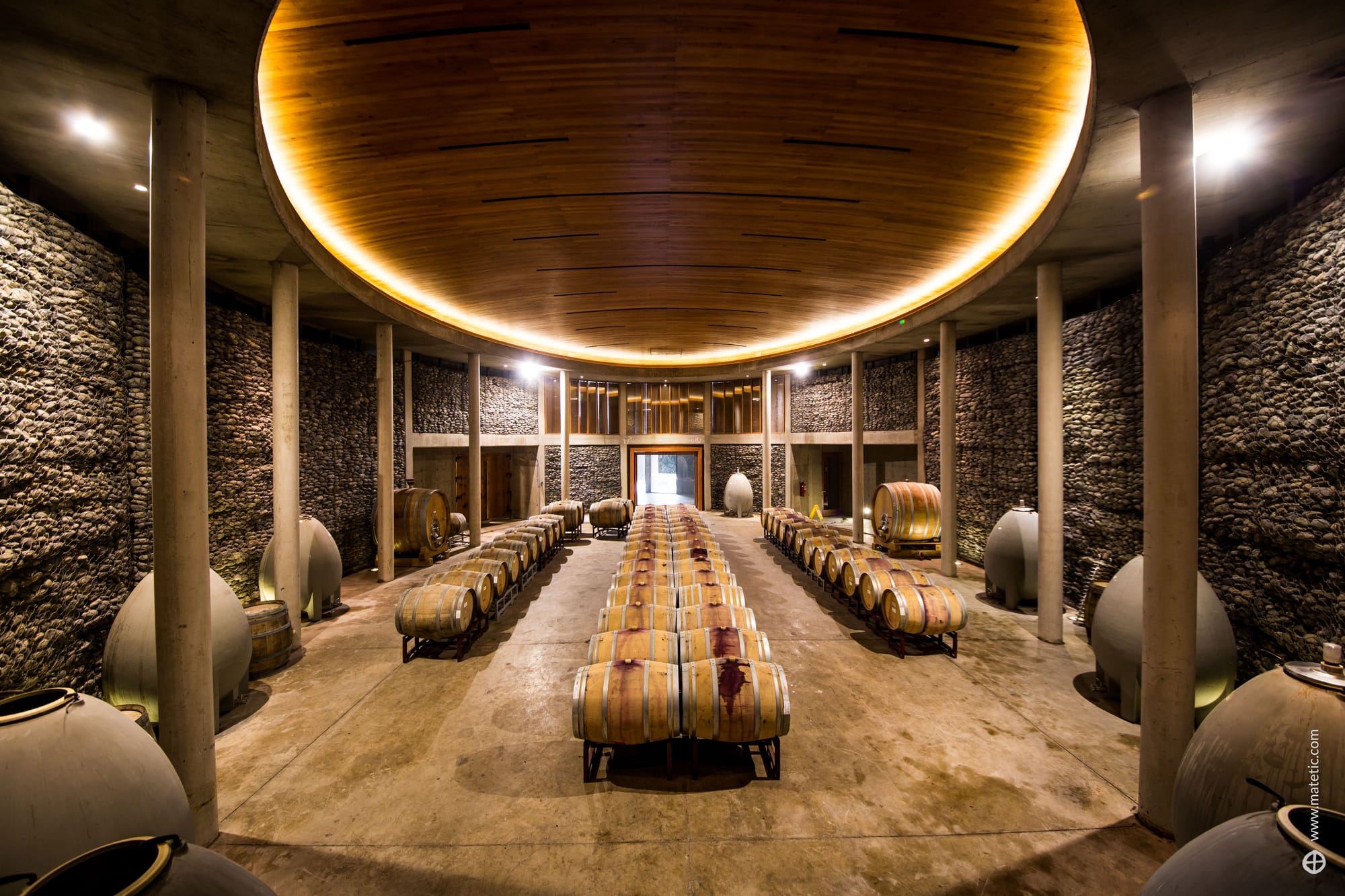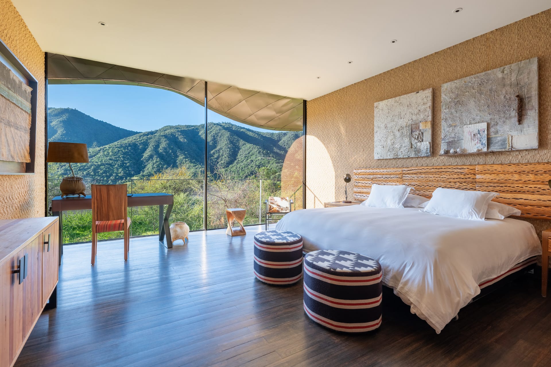Vik Chile, con su cubierta metálica escultórica, domina un anfiteatro de cerros, viñedos y espejos de agua. Al lado, la bodega diseñada por el arquitecto chileno Smiljan Radic es un manifiesto de arquitectura sostenible: se integra al paisaje y utiliza una gran plaza de agua que ayuda a regular la temperatura de las salas subterráneas, reduciendo consumo energético. Viña VIK comunica además que su operación vinícola funciona con energía 100% renovable. La experiencia se completa con Puro Vik, un conjunto de bungalows de vidrio sobre la ladera, y un programa de arte&vino que convierte la estadía en una inmersión sensorial.