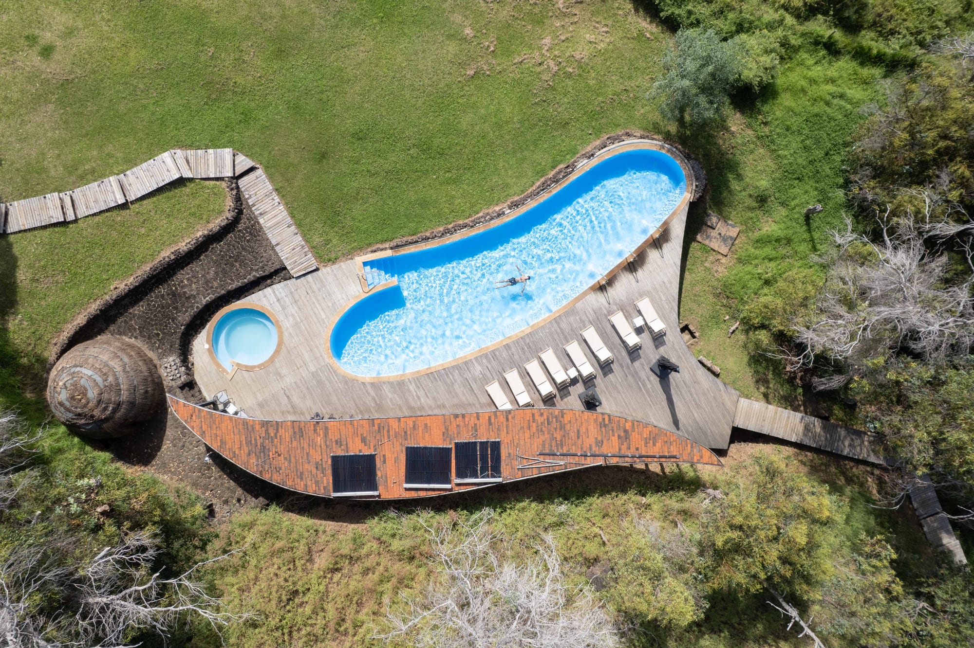 Levantado sobre praderas onduladas con amplias vistas al Pacífico, el lodge de explora en Rapa Nui fue el primer hotel de Sudamérica con certificación LEED de construcción sostenible: incorpora diseño bioclimático, materiales locales (madera de pino y piedra volcánica) y un manejo eficiente de energía y agua.
