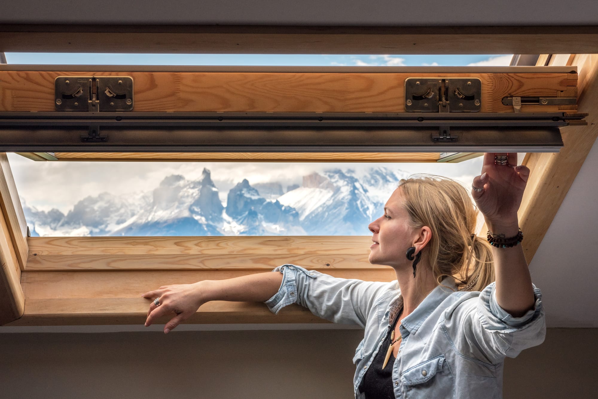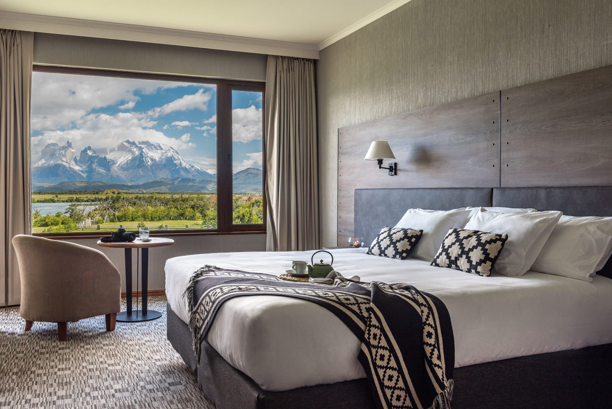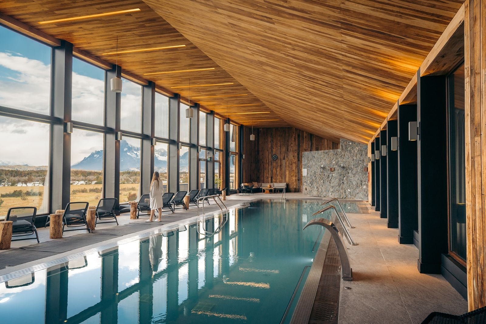 Las habitaciones, distribuidas en varias categorías, destacan por su amplitud y por la abundante luz natural que entra desde la cordillera. Tras las excursiones por el parque, el spa Jenák se convierte en uno de los grandes atractivos del hotel: una piscina climatizada de más de 250 m² con balcones hacia el macizo, sauna y tratamientos inspirados en la naturaleza magallánica.