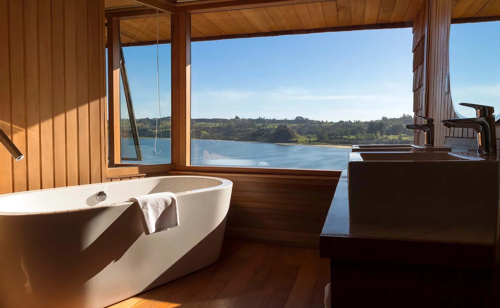 Refugia se posa en lo alto de una loma verde mirando al mar interior frente a Castro. El edificio, de líneas contemporáneas y revestido con tejuelas de madera al modo chilote, dialoga con el paisaje de praderas, bosques y canales; dentro, ventanales panorámicos convierten el fiordo en un cuadro cambiante. La experiencia se completa con excursiones guiadas (kayak, navegación por canales, paseos por iglesias y palafitos) y una mesa que rescata pescas del día y productos de huertas y artesanas locales.