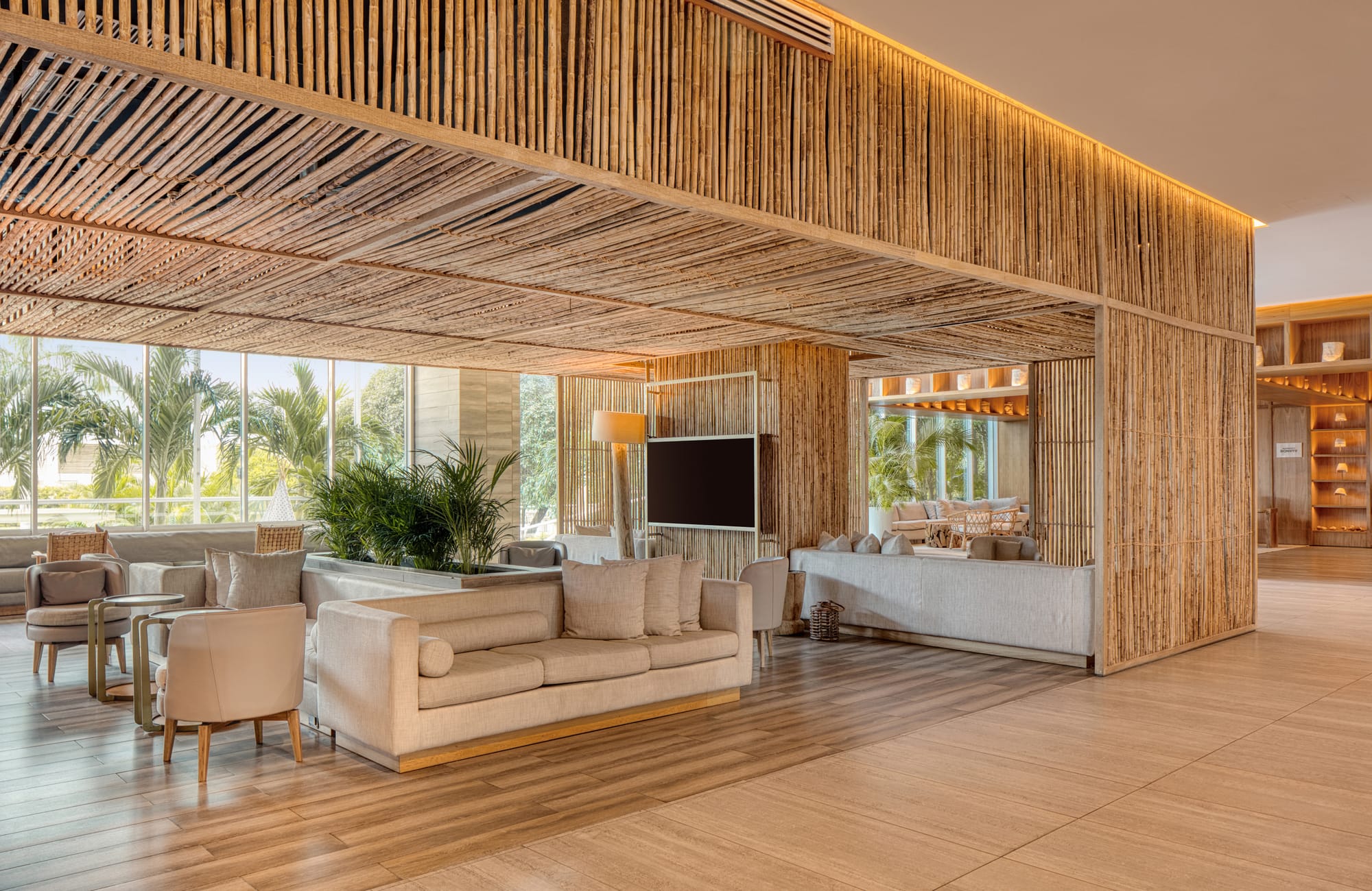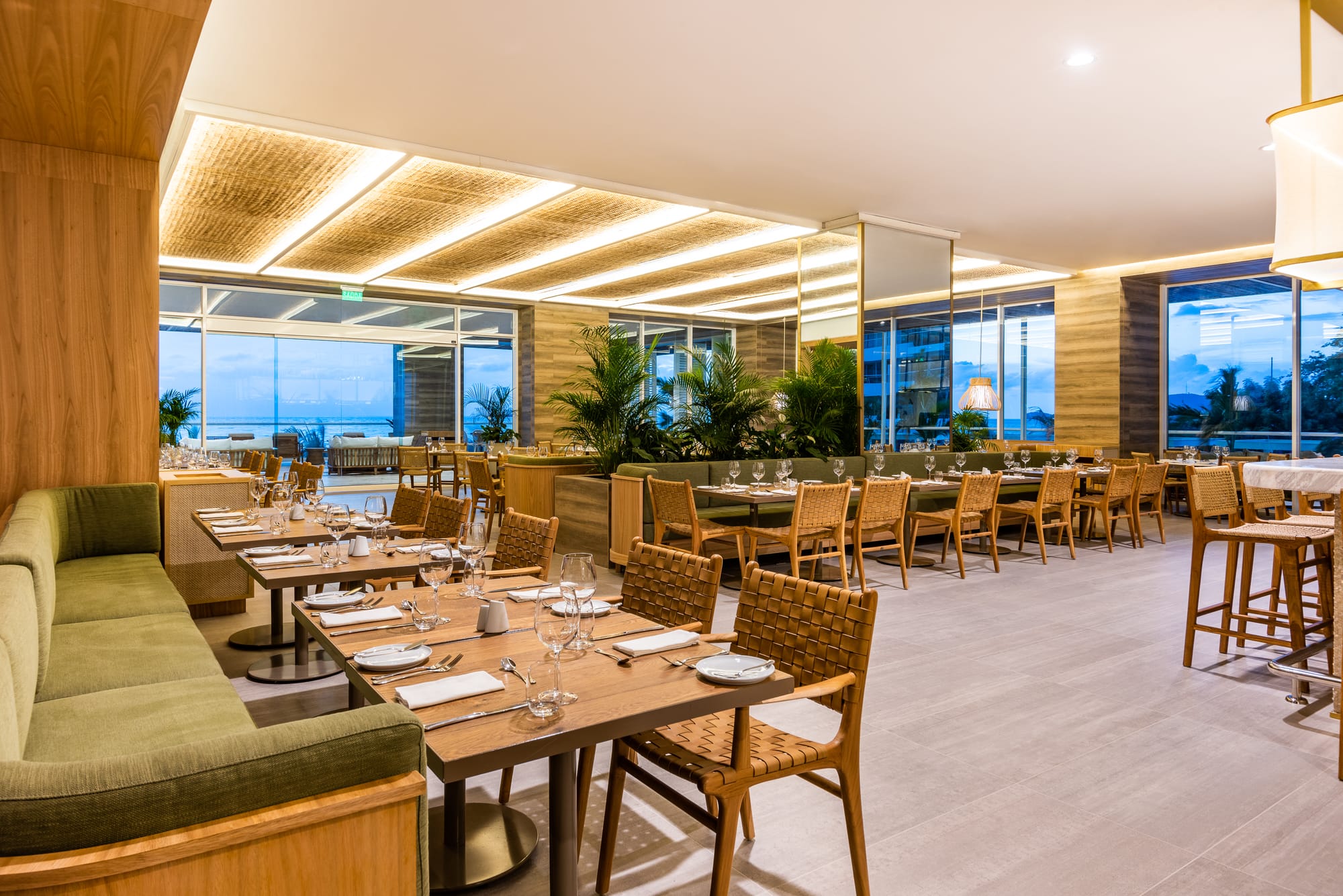 El diseño interior incorpora madera, fibras naturales y acabados en piedra que buscan una continuidad visual con la montaña y el mar. Los techos altos y el uso de la ventilación cruzada en áreas comunes reflejan una planificación consciente de las condiciones climáticas tropicales, mientras que la disposición de los espacios permite una transición fluida entre el entorno urbano y la zona de playa, manteniendo siempre una estética sobria y profesional.