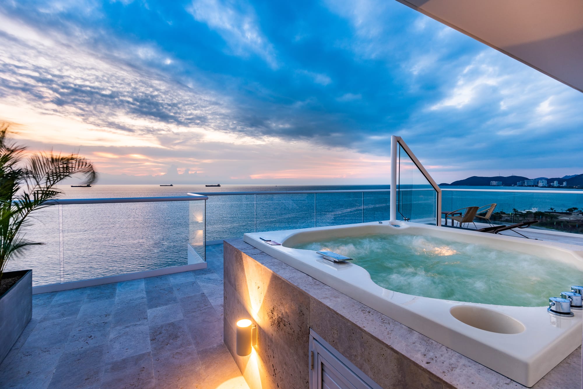 Uno de los puntos clave de las habitaciones es la integración con el entorno exterior a través de ventanales completos que dan paso a balcones privados, equipados con mobiliario de exterior de líneas modernas. Desde estas terrazas, los huéspedes disfrutan de vistas directas al mar y, en las suites principales, cuentan con jacuzzi privado.