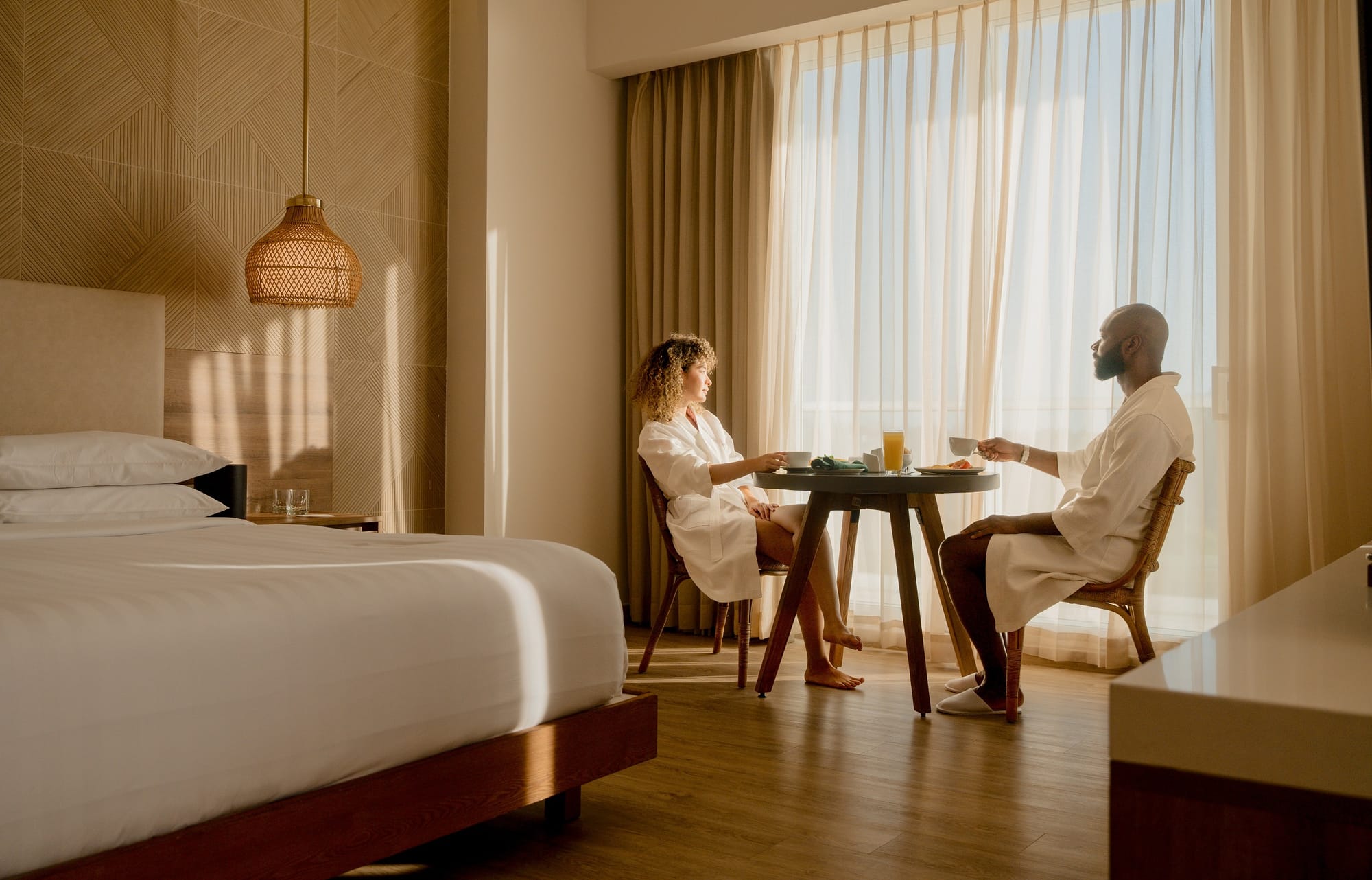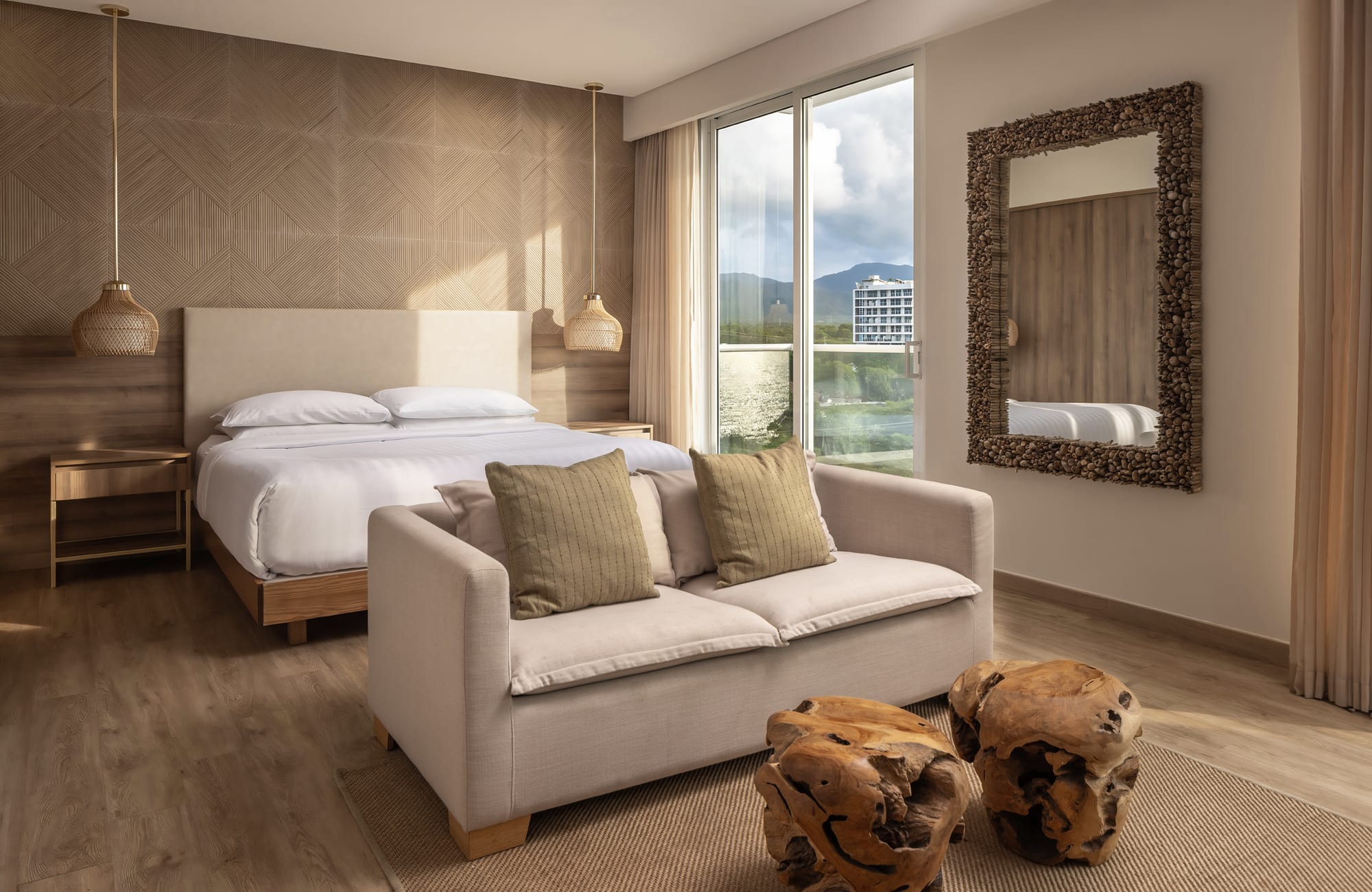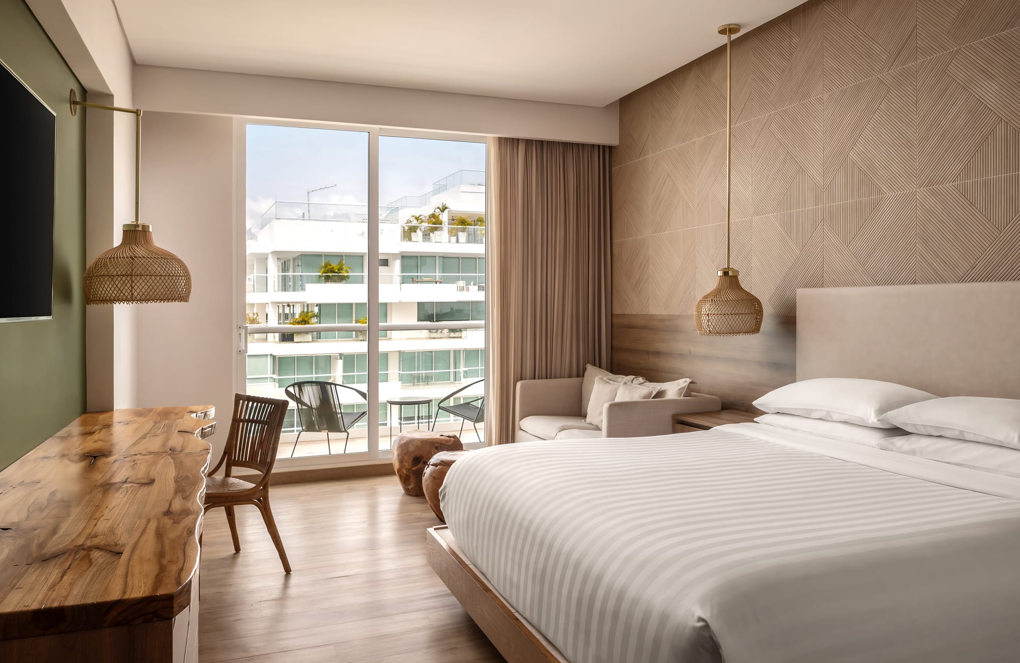 El diseño de las habitaciones en el Santa Marta Marriott Resort Playa Dormida sigue una línea de coherencia estética que prioriza la funcionalidad y el uso de texturas orgánicas. Al entrar en las estancias, se observa un predominio de la madera en tonos claros, presente tanto en los suelos como en el mobiliario de diseño lineal. Un elemento central de la decoración es el escritorio de madera sólida con bordes irregulares, que aporta un componente rústico y robusto al espacio de trabajo.