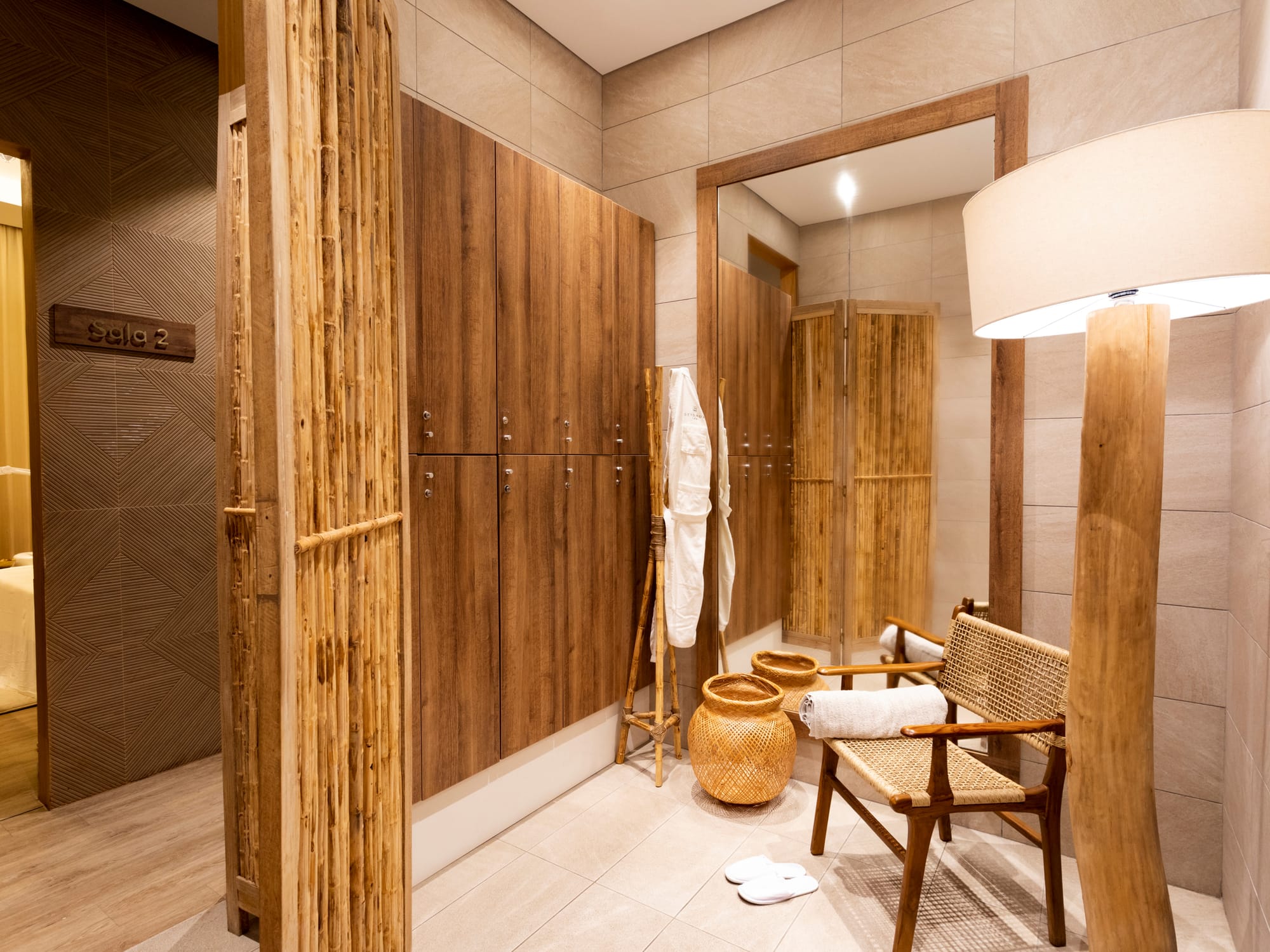 Este se complementa con sillas de tejido artesanal en fibras naturales, reforzando la identidad regional del mobiliario sin recurrir a elementos puramente ornamentales. La iluminación está resuelta mediante lámparas colgantes con pantallas de mimbre que distribuyen la luz de manera uniforme sobre las mesas de noche y las áreas de descanso.