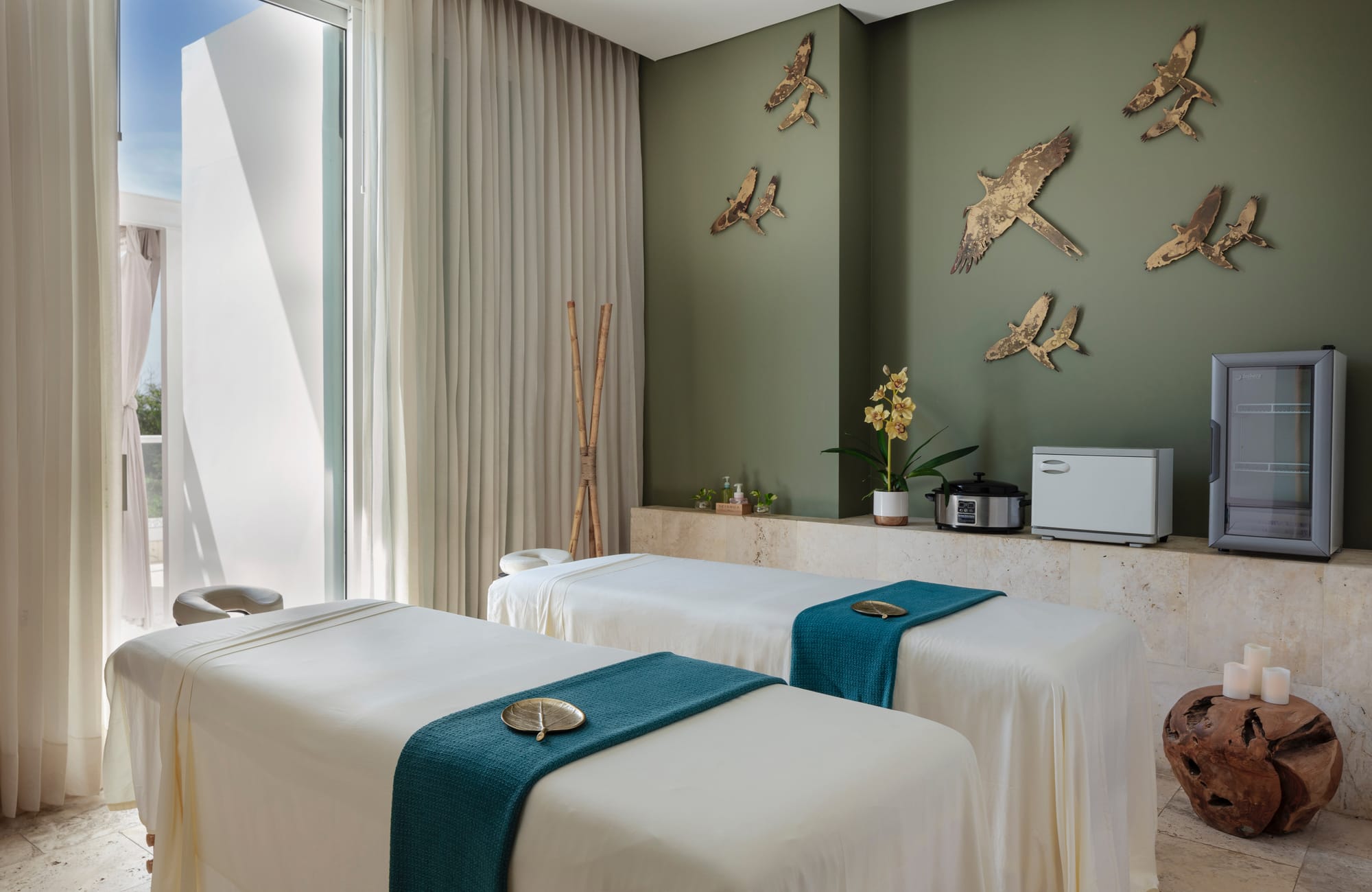 La paleta de colores se mantiene en una escala de tonos neutros y verdes oliva, aplicados en muros de acento que sirven de fondo para las pantallas de televisión de gran formato. En las paredes principales, destaca un revestimiento con patrones geométricos tallados que añade profundidad visual al espacio, acompañado por figuras metálicas en relieve que representan la fauna local y otros elementos del entorno.
