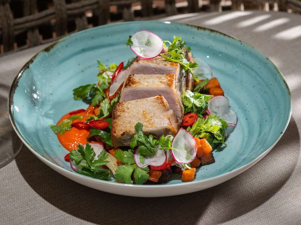 Durante el día, el hotel ofrece una carta de platos y aperitivos que combina sencillez bien ejecutada con guiños al producto local. Una alternativa ideal para quienes vuelven cansados de las excursiones o buscan comodidad sin renunciar a la calidad.
