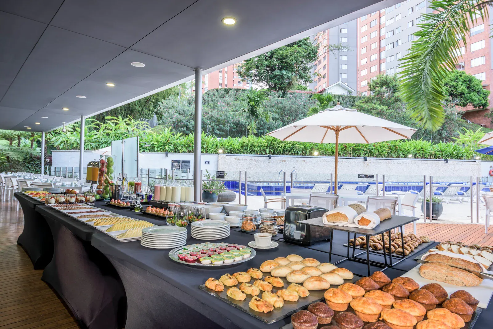 Uno de los espacios más llamativos del hotel es su piscina exterior, rodeada de palmeras y tumbonas orientadas hacia el skyline de El Poblado. Un auténtico oasis en medio de una ciudad que suele presumir de un clima perfecto para un baño.