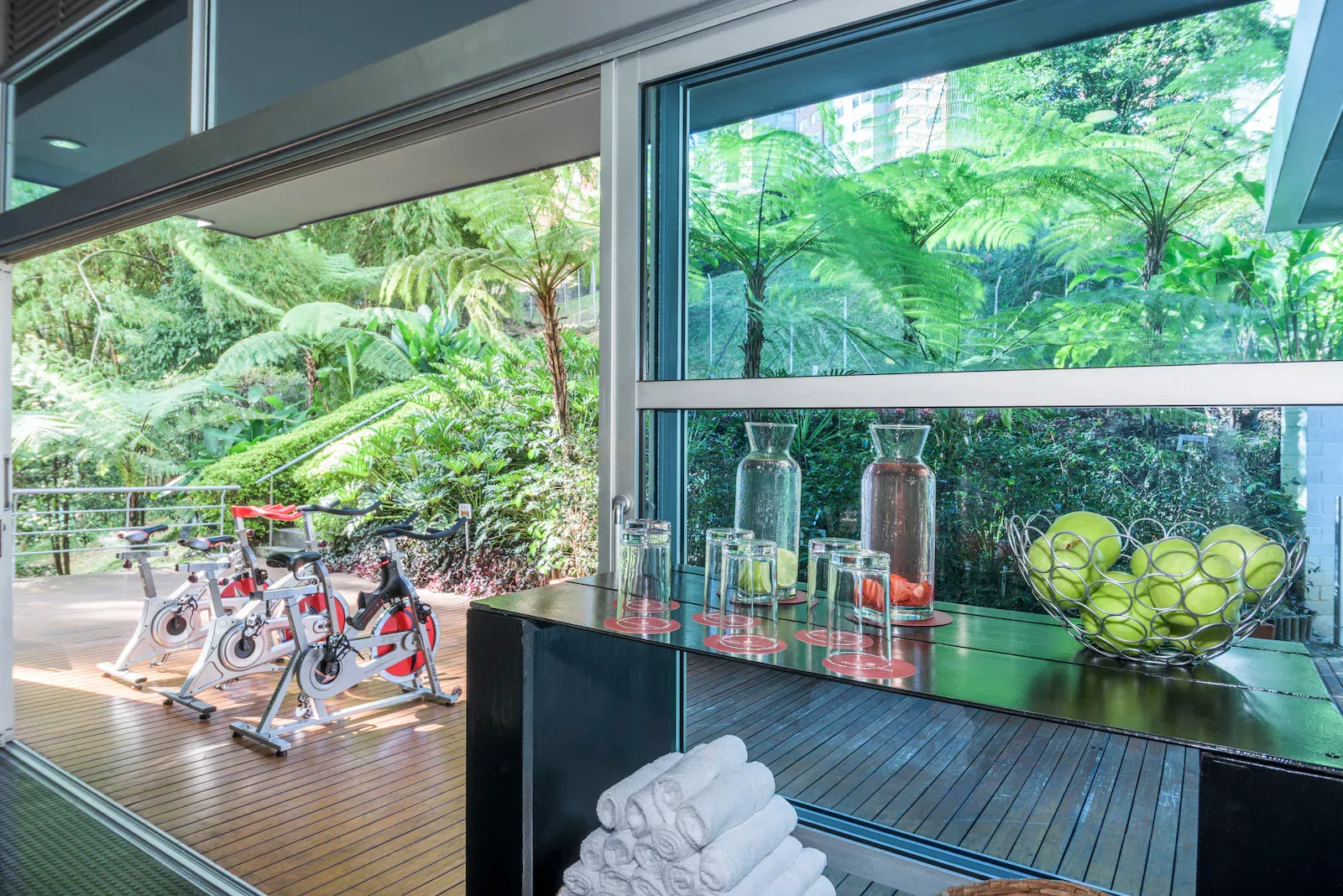 El área de spa ofrece masajes, tratamientos faciales, bañera de hidromasaje y zonas de relajación pensadas para desconectar del ritmo urbano. Para quienes mantienen su rutina deportiva incluso durante los viajes, el hotel cuenta con un gimnasio bien equipado con máquinas de cardio y musculación.