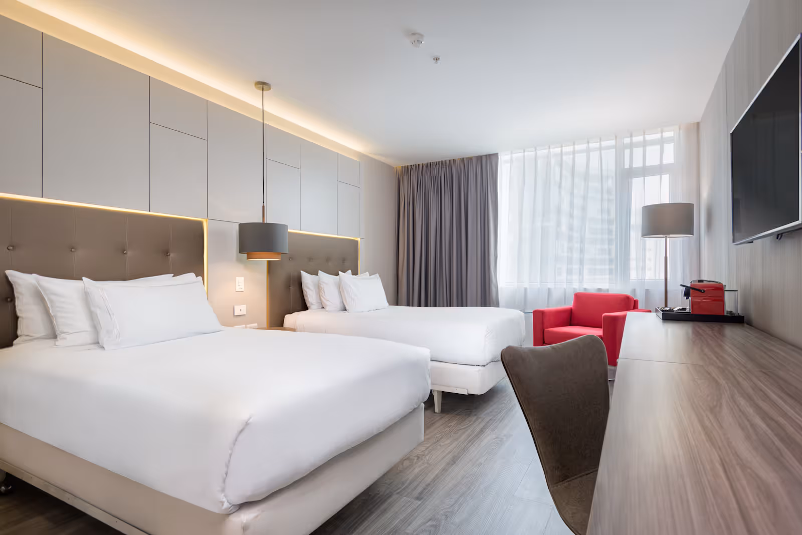 El NH Collection Medellín Royal dispone de 135 habitaciones, todas comparten una misma filosofía estética: espacios amplios, diseño actual, tonos neutros y una apuesta decidida por la luz natural. Presentan un estilo minimalista chic, con suelos de madera clara, decoración sobria y mobiliario elegante. Las camas, disponibles en formato king o twin, ofrecen colchones de calidad superior, carta de almohadas y ropa de cama suave, pensada para garantizar un descanso profundo tras un día de trabajo o exploración urbana.