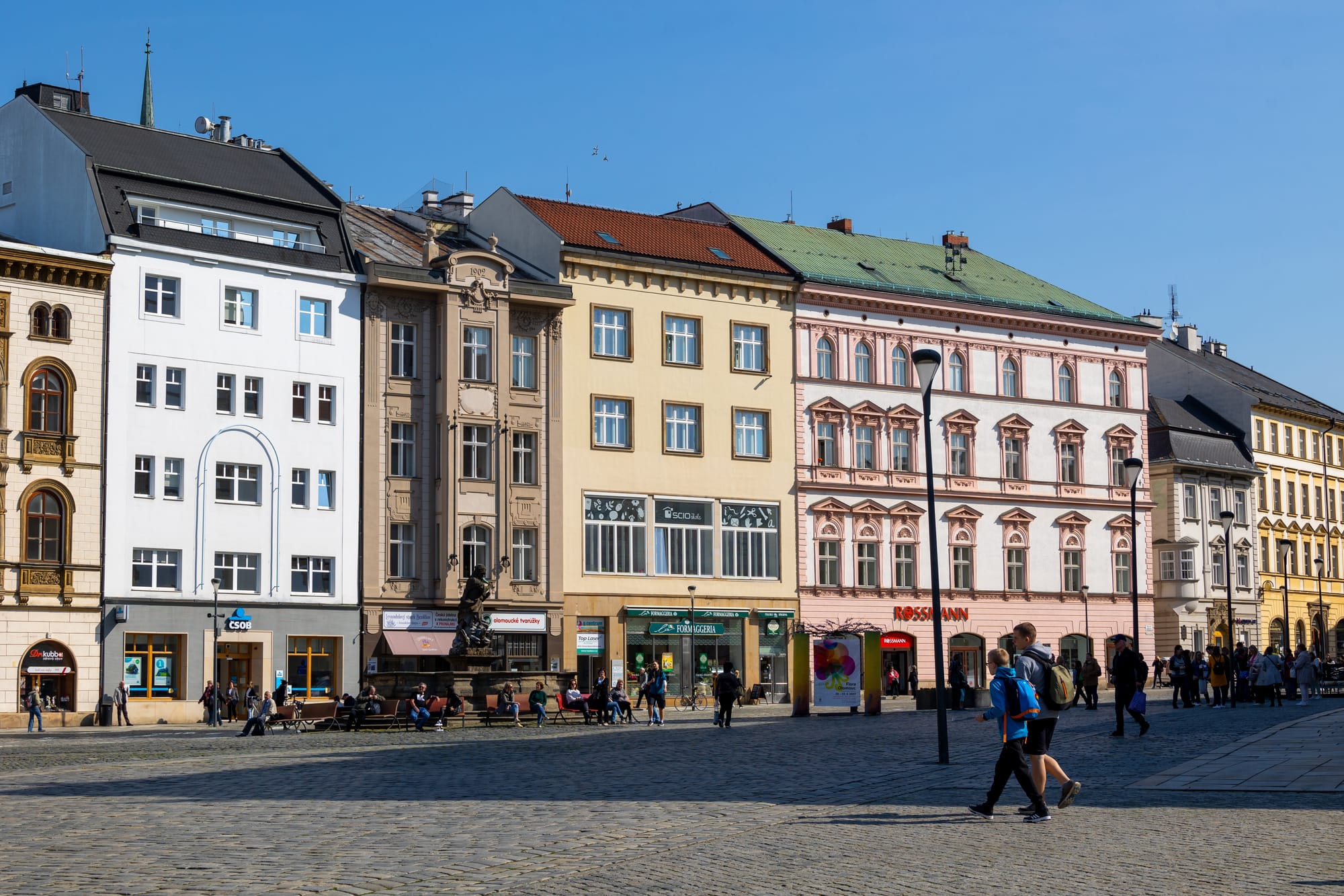 El corazón del casco histórico lo configuran dos plazas contiguas que rivalizan en belleza: Horní Náměstí (Plaza Alta) y Dolní Náměstí (Plaza Baja). Ya hemos dicho que Olomouc presume de sus fuentes barrocas y solo en la plaza Dolní lucen dos de ellas, la de Neptuno y la de Júpiter, custodiando una columna mariana que conmemora la plaga de peste que asoló Olomouc entre 1713 y 1715.