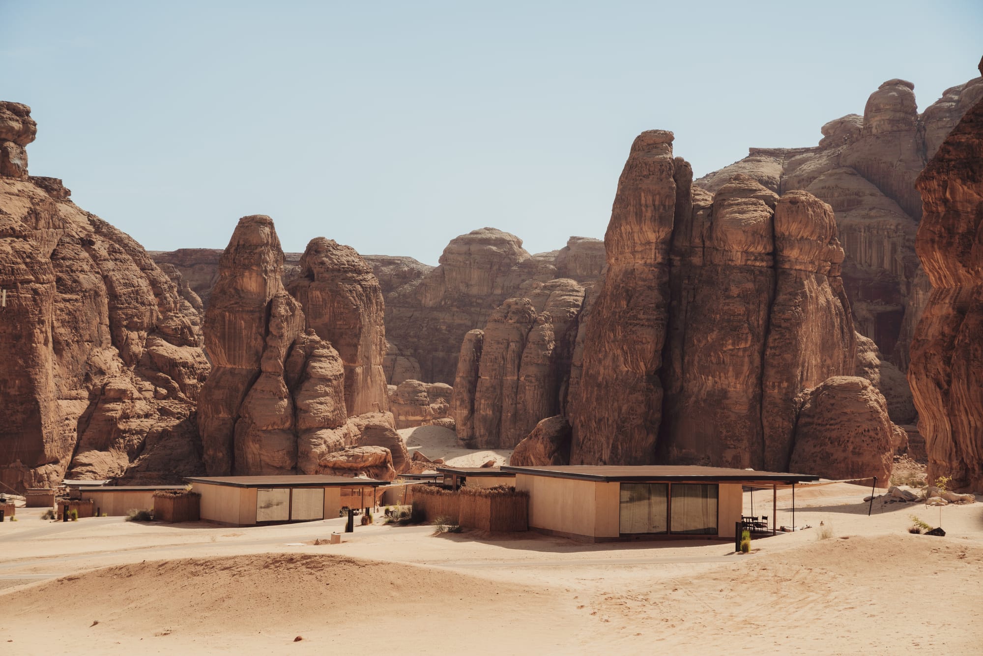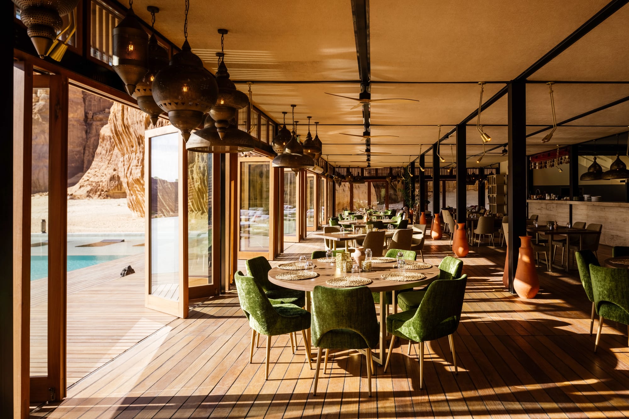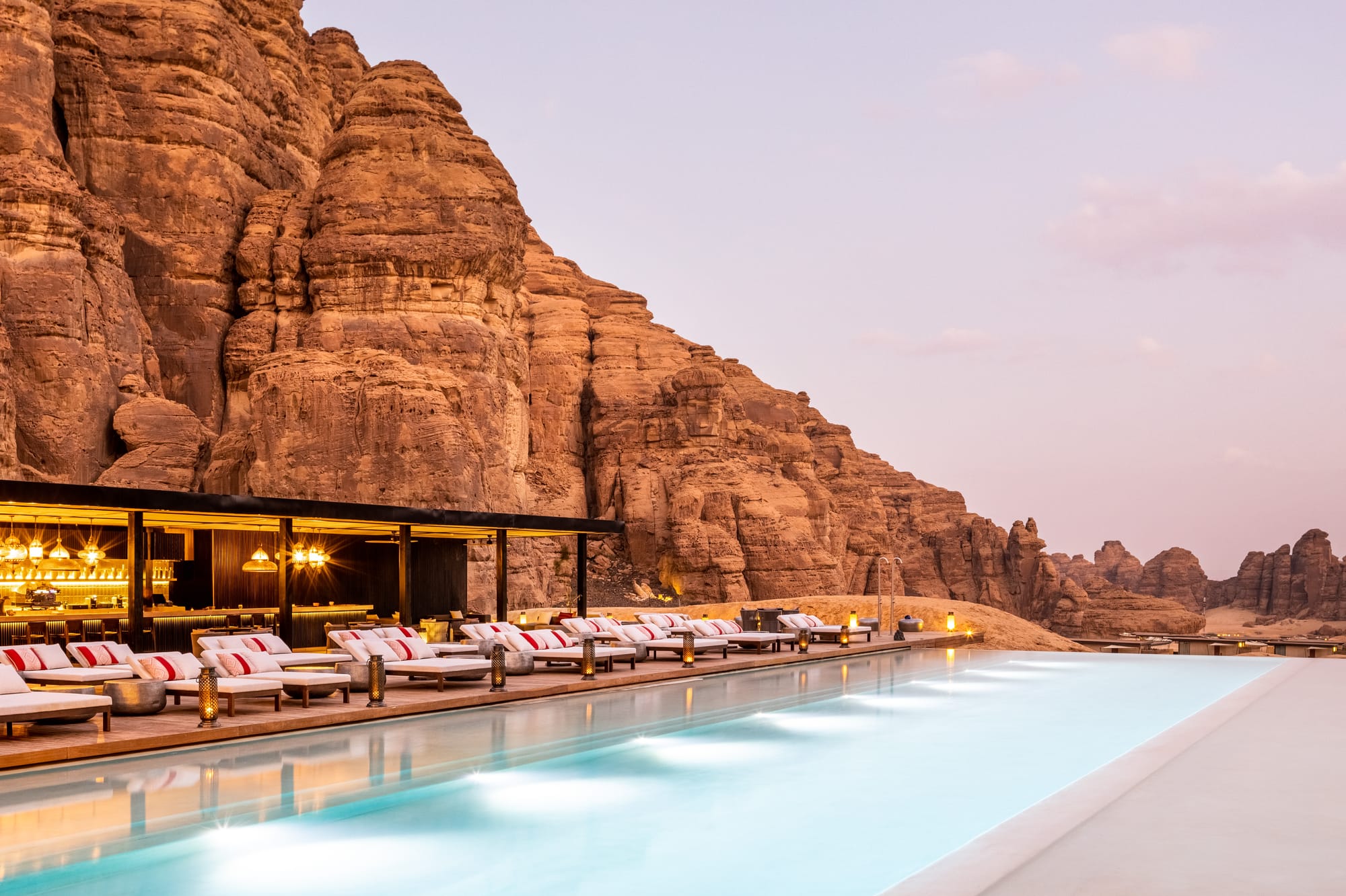 El espacio conocido como Ágora funciona como corazón social del complejo, el punto de reunión donde el fuego de una hoguera y el cielo abierto añaden una dimensión casi ceremonial a la convivencia entre huéspedes. La piscina infinita, con vistas al valle de Ashar, es otro de los escenarios centrales del resort, un lugar donde el agua y el paisaje de roca y arena se funden en una imagen que resulta difícil de olvidar y que se ha convertido en una de las postales más famosa de Arabia Saudi gracias a, o por culpa de, Instagram.