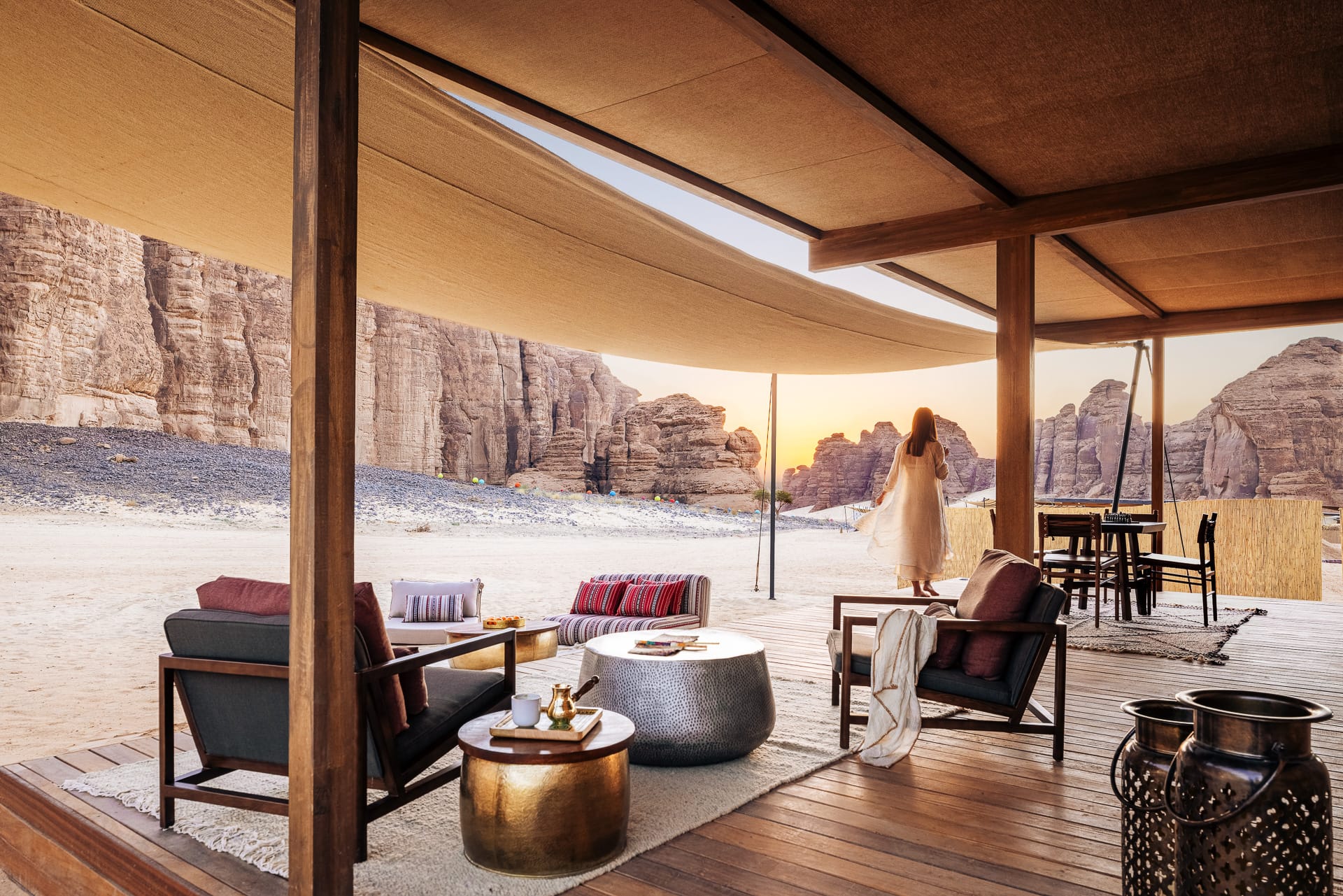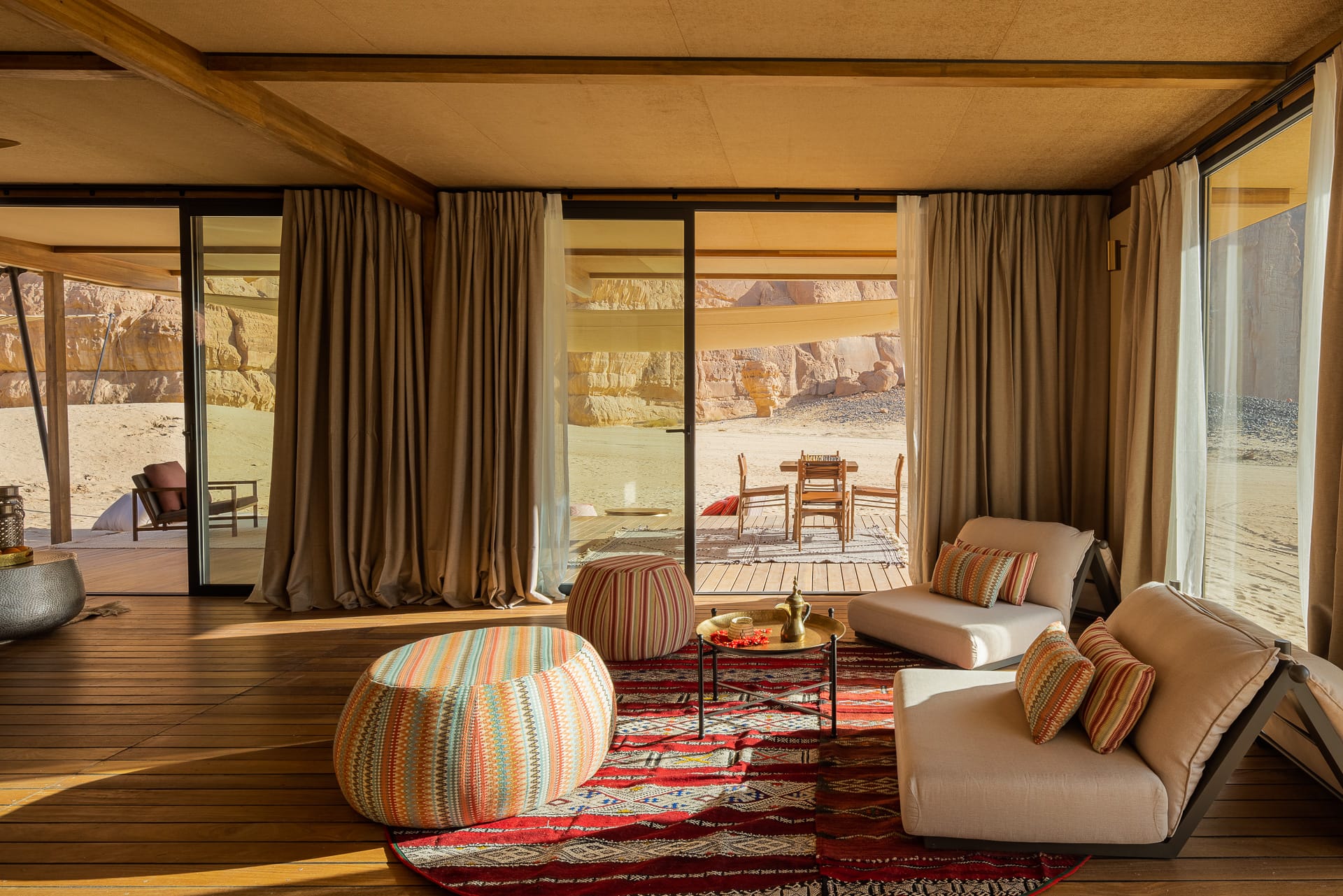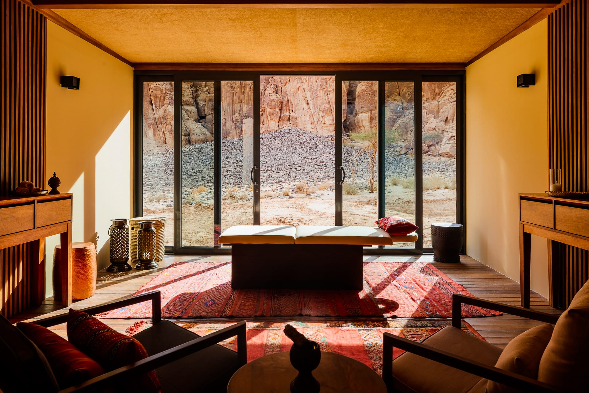 El espacio conocido como Ágora funciona como corazón social del complejo, el punto de reunión donde el fuego de una hoguera y el cielo abierto añaden una dimensión casi ceremonial a la convivencia entre huéspedes. La piscina infinita, con vistas al valle de Ashar, es otro de los escenarios centrales del resort, un lugar donde el agua y el paisaje de roca y arena se funden en una imagen que resulta difícil de olvidar y que se ha convertido en una de las postales más famosa de Arabia Saudi gracias a, o por culpa de, Instagram.