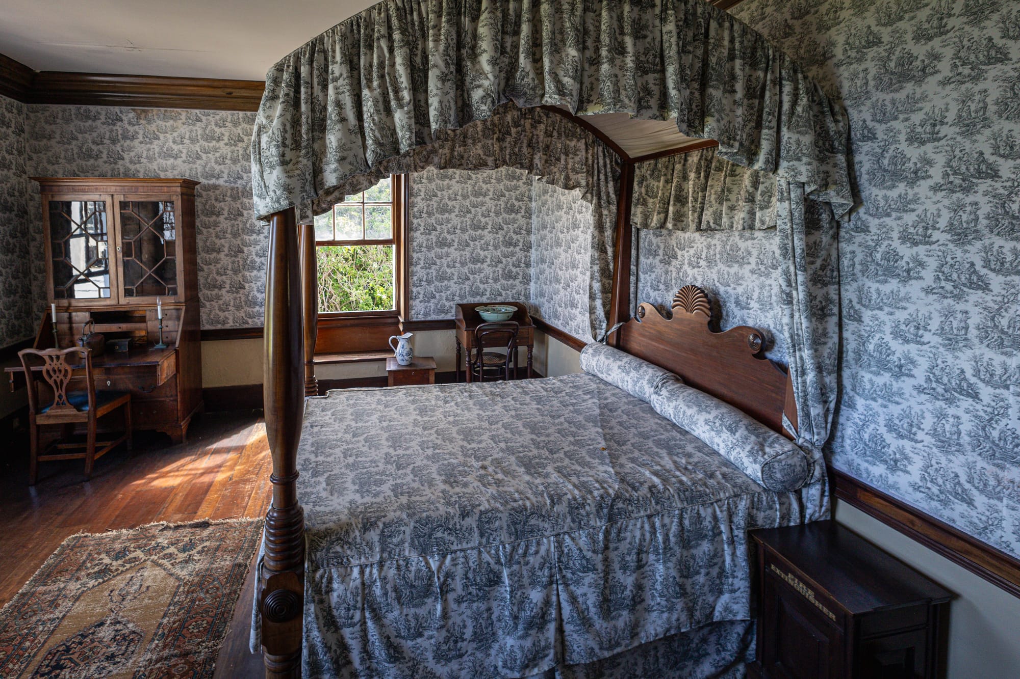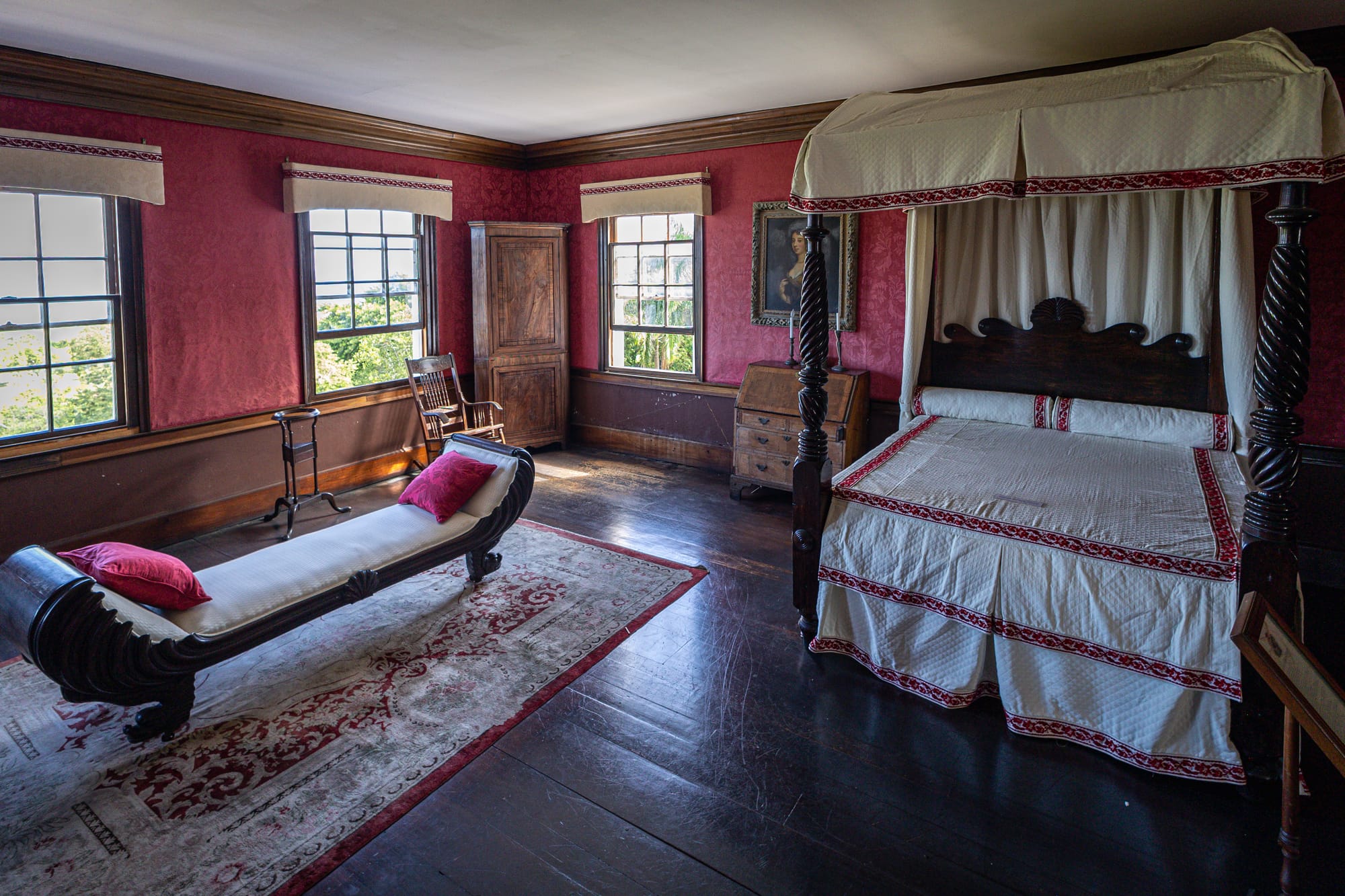El recorrido nos conduce entonces hasta el dormitorio principal de Annie Palmer. La estancia está dominada por telas rojas, un color que se repite en cortinas y tapicerías y que marca el carácter del espacio sin sutilezas. En un rincón se conserva un diván original, uno de los muebles más llamativos de la casa. Desde aquí se desgrana la historia del triángulo amoroso que protagonizó junto a su contable, Robert Rutherford, y Millicent, una joven vinculada a la comunidad esclavizada. Relatos de celos, castigos y tensiones crecientes desembocan en un desenlace violento que acaba con la muerte de Annie a manos de un esclavo rebelde.