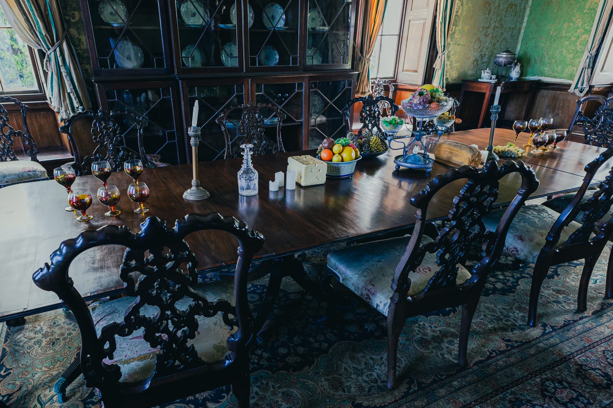 El comedor principal se abre a continuación, con su mesa dispuesta como en una recepción formal. Se muestran piezas de porcelana importadas, otras vajilla y una caja de cuchillos que la guía menciona con cierta ironía al recordar que, según cuentan las malas lenguas, Annie utilizó armas blancas para asesinar a uno de sus maridos mientras dormía.