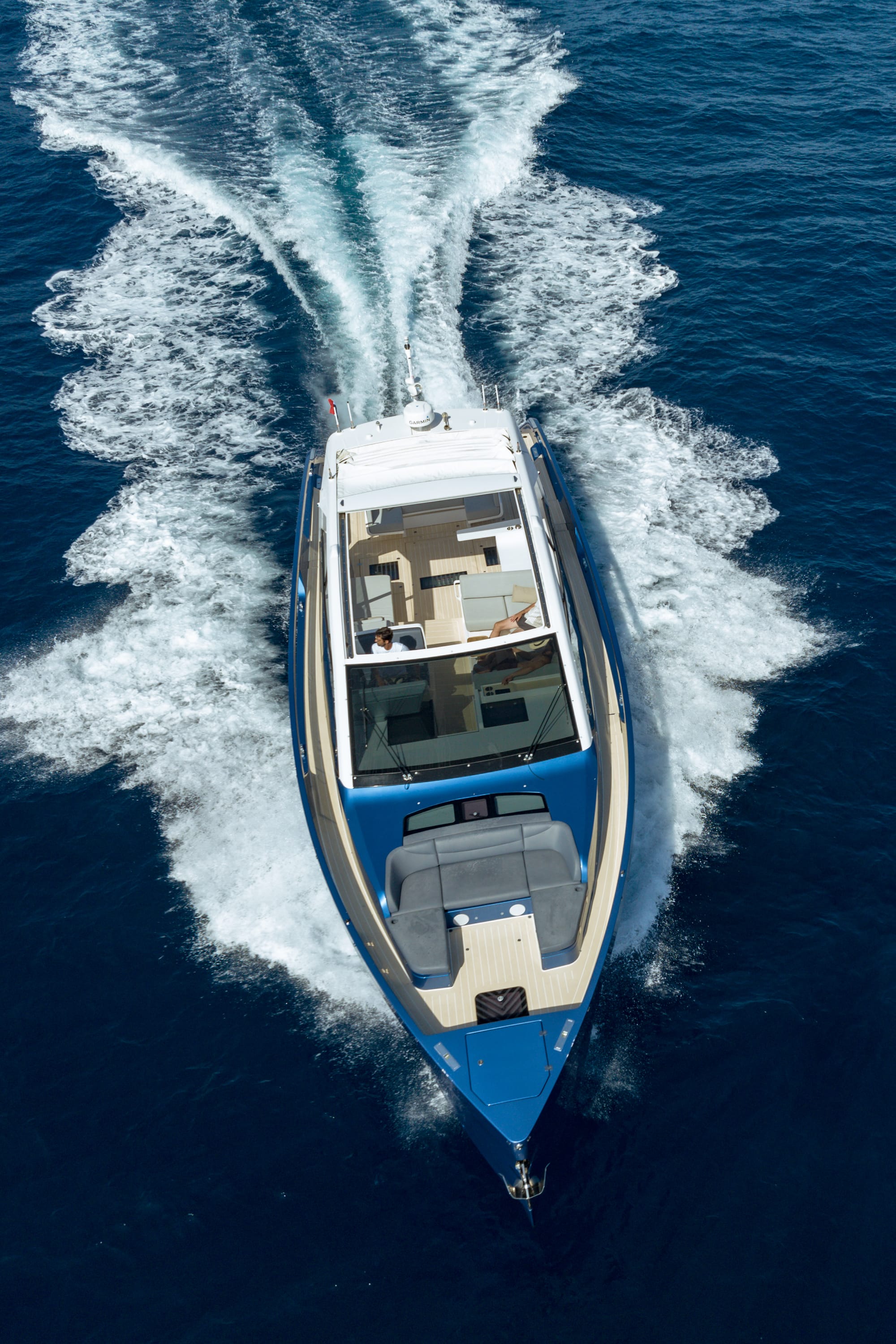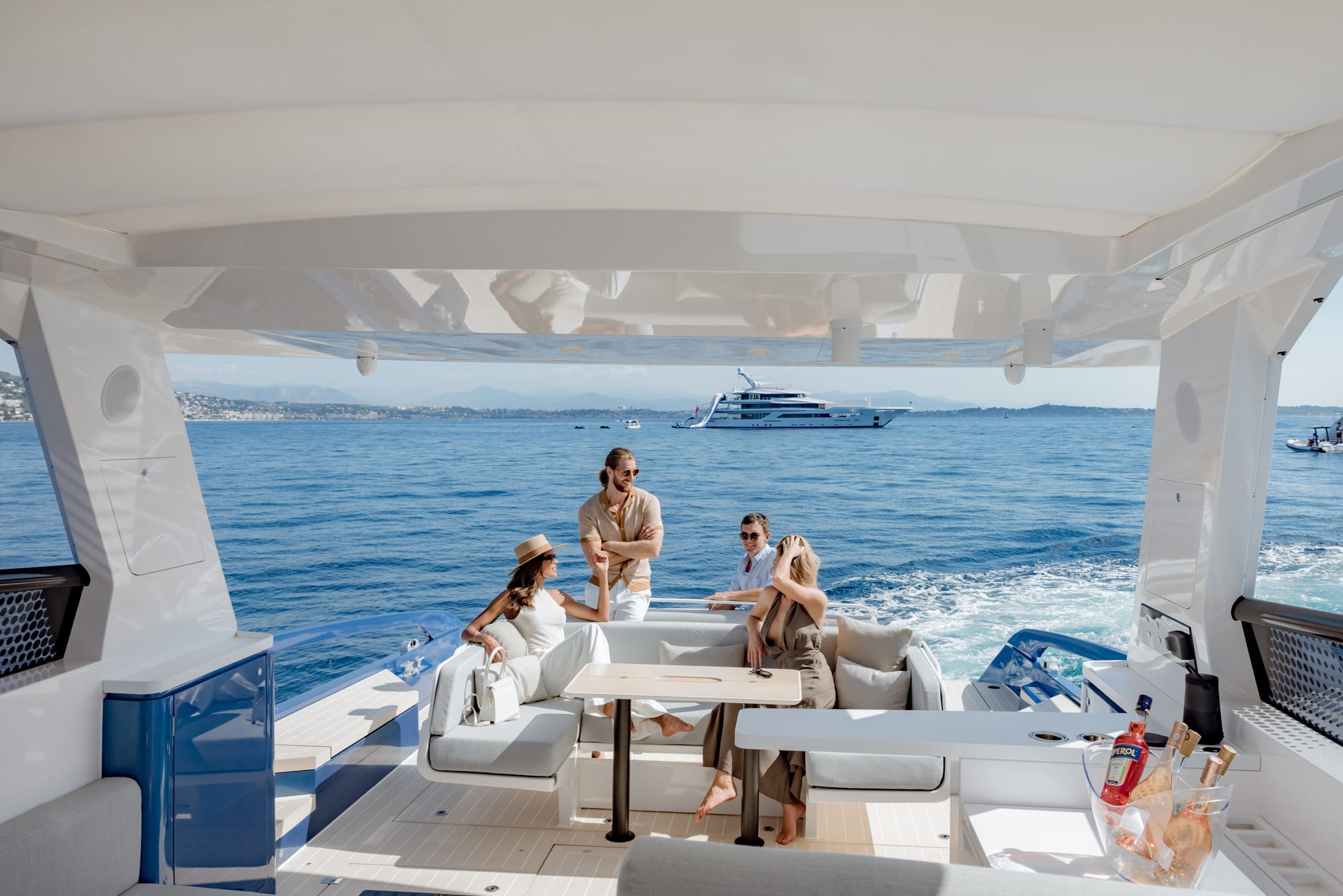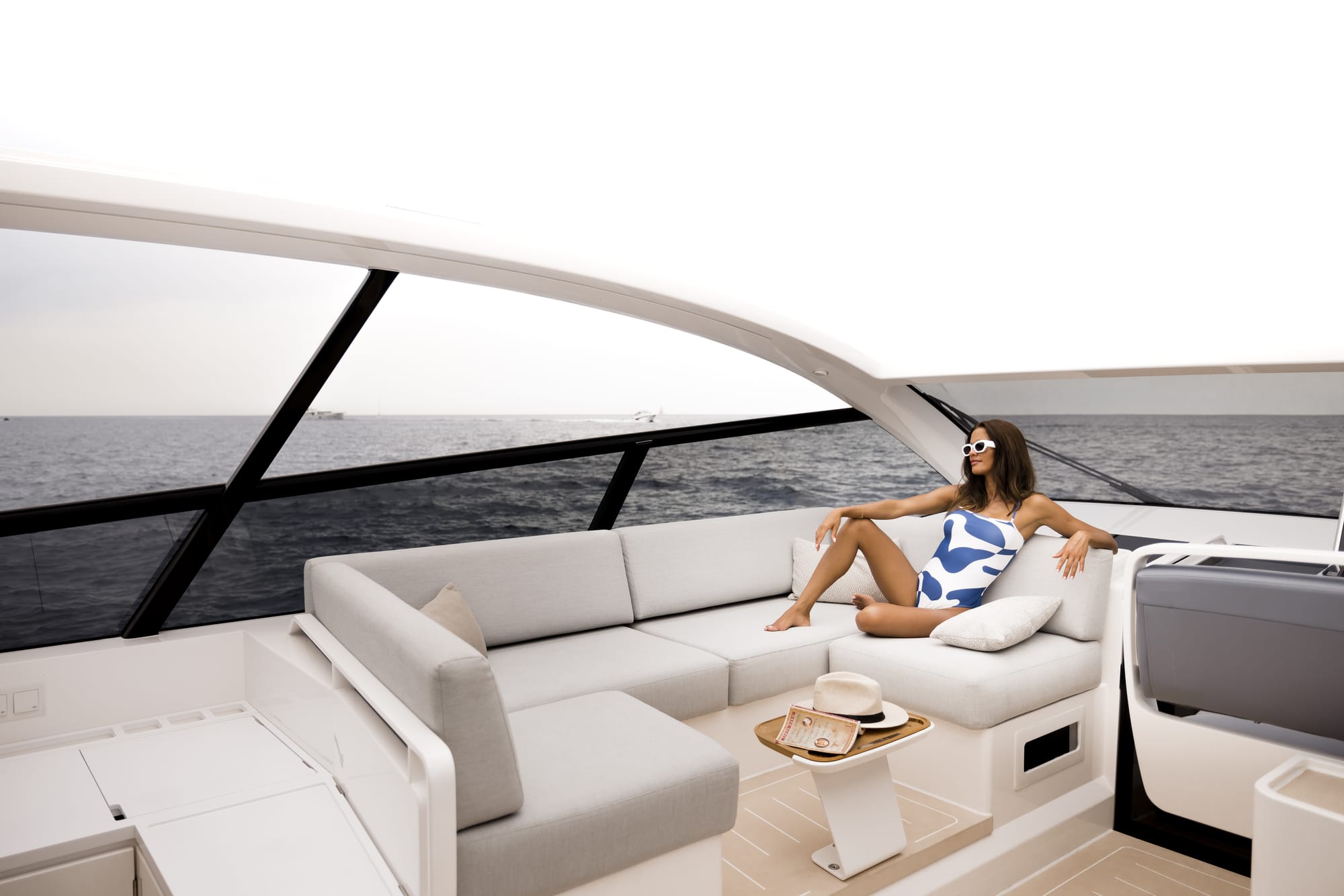 En cubierta, el yate ofrece un cockpit climatizado, amplias zonas lounge, un beach club con laterales abatibles y un garaje para una embarcación auxiliar de 3,3 metros. El conjunto combina funcionalidad, confort y estética minimalista.