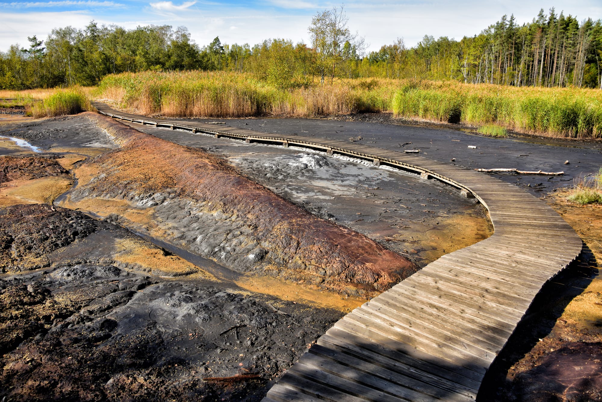 Por allí emergen fumarolas (emanaciones de dióxido de carbono), pequeñas “chimeneas” de barro y manantiales minerales que han creado un paisaje que parece sacado de otro planeta.