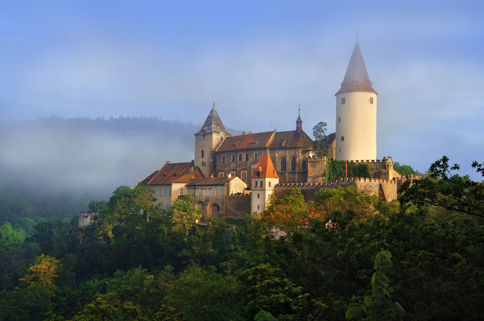 Enclavado en medio del bosque del mismo nombre, este castillo gótico fue durante siglos residencia de caza y fortaleza real. Desde sus murallas y la gran torre cilíndrica se domina un valle boscoso que hoy forma parte de una amplia área protegida. Dentro podemos recorrer salas con colecciones de caza, una biblioteca histórica y una antigua prisión. Tras la visita, solo nos queda poner rumbo de vuelta a Praga, a poco más de una hora en coche.
