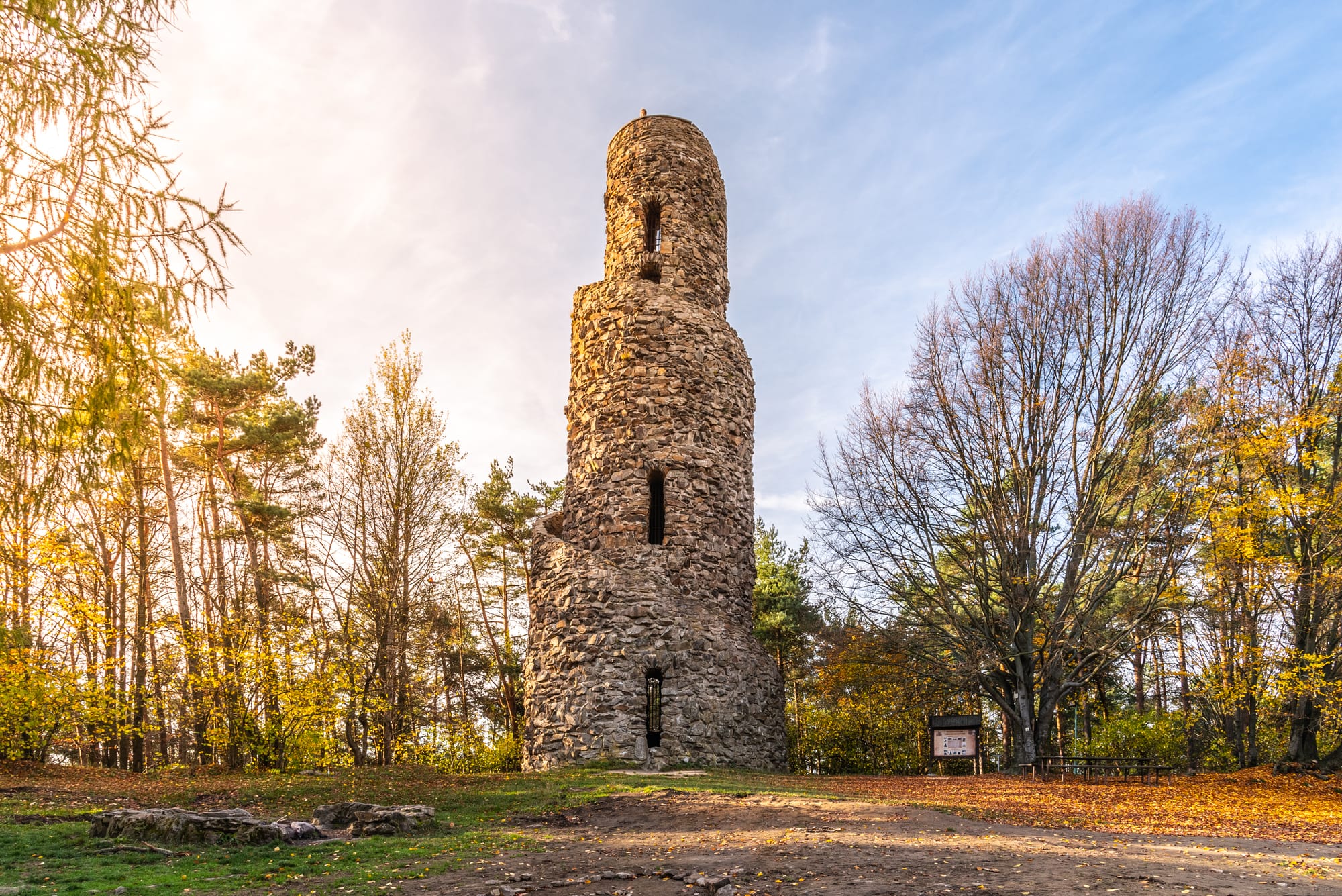 Hoy toca una jornada variada. Salimos de Karlovy Vary rumbo a los Montes Metálicos y nos dirigimos primero a la torre mirador de Krásno. Esta torre de piedra, de unos 25 metros de altura, se construyó entre 1933 y 1935, en plena crisis económica, como proyecto para dar trabajo a los vecinos de la zona. Se alza a 777 metros sobre el nivel del mar, en pleno bosque de Slavkov, justo en el centro del triángulo formado por Karlovy Vary, Mariánské Lázně y Františkovy Lázně.