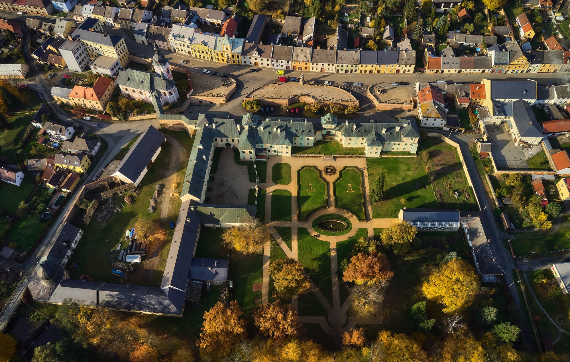 Terminamos el día en Manětín, a unos kilómetros al norte, ya en un paisaje de colinas de origen volcánico y bosques poco habitados. El pueblo es conocido como la “perla barroca de Bohemia del Oeste”, y el apodo no es exagerado. El Palacio de Manětín, residencia de la familia Lažanský, domina la plaza, rodeado de un parque romántico y de un conjunto de esculturas barrocas, obra de escultores como Štěpán Borovec y su discípulo Josef Herscher.