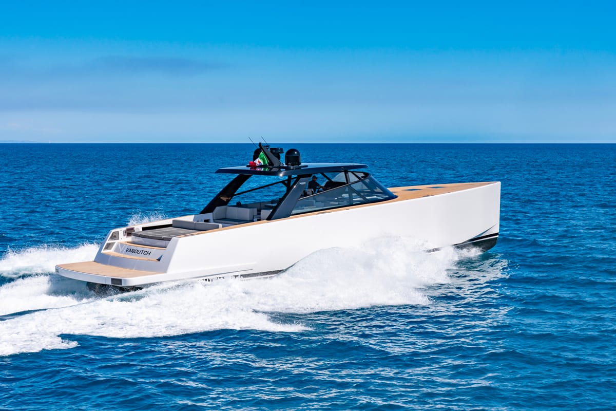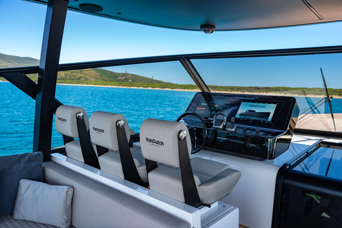 Los asientos, con tapicería acanalada inspirada en los deportivos clásicos, establecen un diálogo visual entre exterior e interior, mientras que el nuevo hard-top de fibra de carbono protege la zona del salón sin romper la armonía del perfil. Incluso los detalles más pequeños —como la puerta integrada en el parabrisas que conecta directamente con la proa o el ancla invisible que emerge desde el casco— reflejan la obsesión de VanDutch por la pureza de líneas.