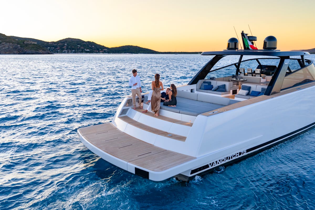 Gracias a su triple motorización Volvo Penta IPS (en versiones 1050 u 1350), el VanDutch 75 alcanza los 40 nudos de velocidad máxima, con una navegación ágil y eficiente, fiel a su reputación como símbolo del lujo rápido.
