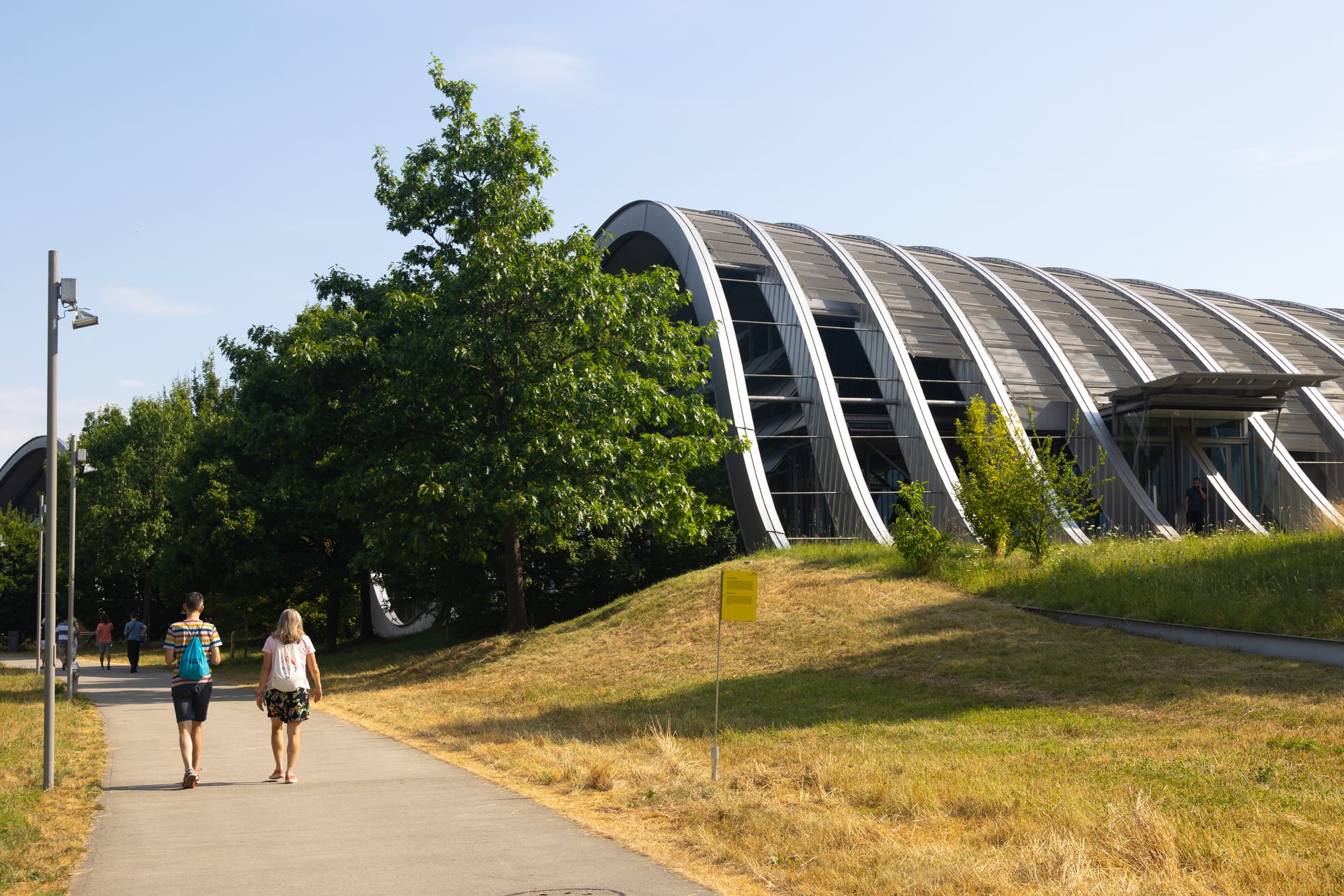 El Zentrum Paul Klee no termina cuando se cruzan sus puertas de vidrio y acero: el entorno que lo rodea forma parte integral de su identidad y de la experiencia de la visita. El museo se ubica en un terreno cultivable de unas 9 hectáreas conocido como Fruchtland, una palabra alemana que puede traducirse como “tierra fértil” o “tierra de frutos”, y que da nombre también a la dirección del centro. Este espacio no es un parque estético, sino un paisaje vivo en el que confluyen agricultura, biodiversidad y cultura.